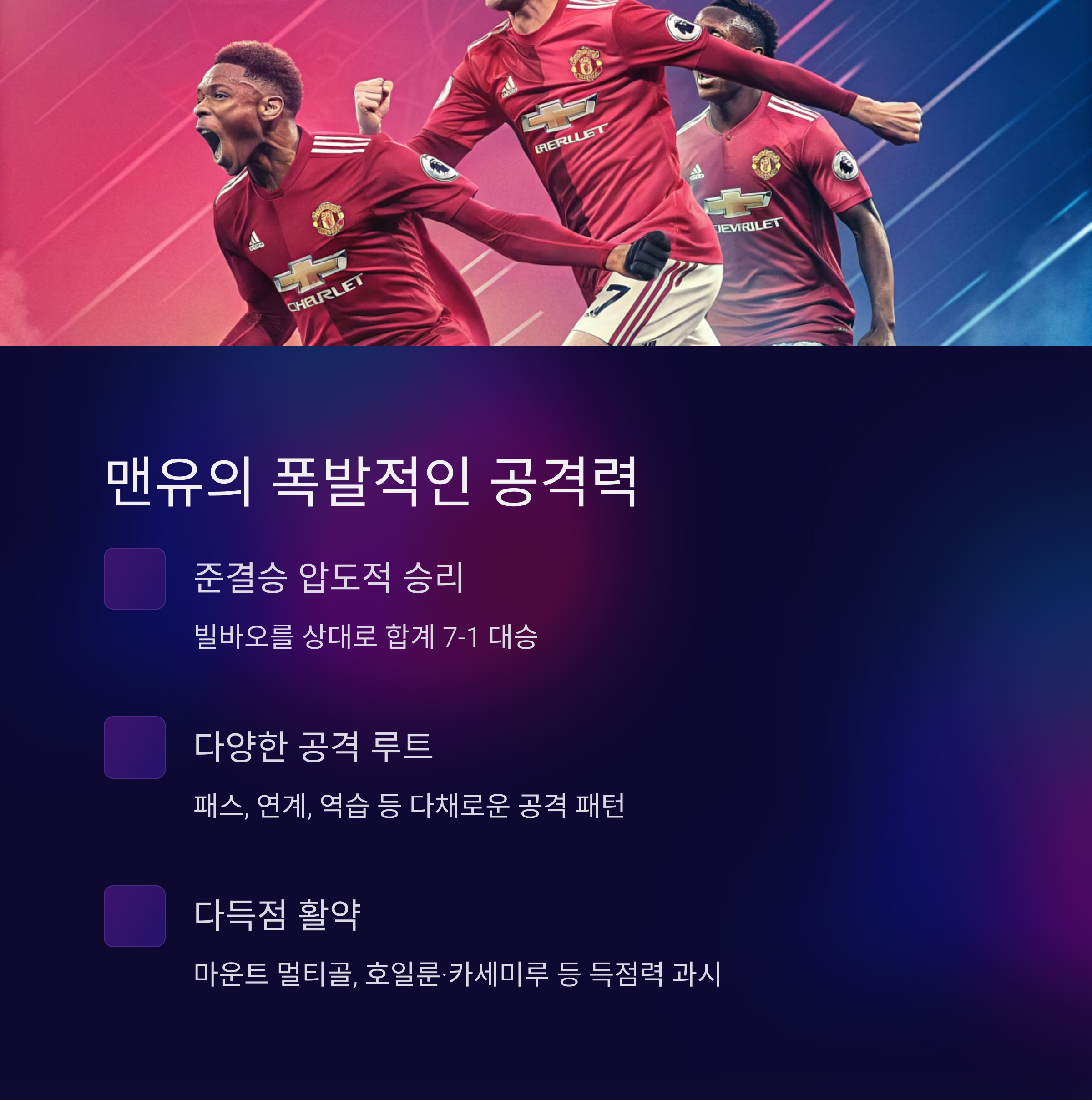 1. 맨유는 공격적인 플레이로 강력한 득점력을 보이며 준결승에서 압도적인 성적(7-1)을 기록했습니다.