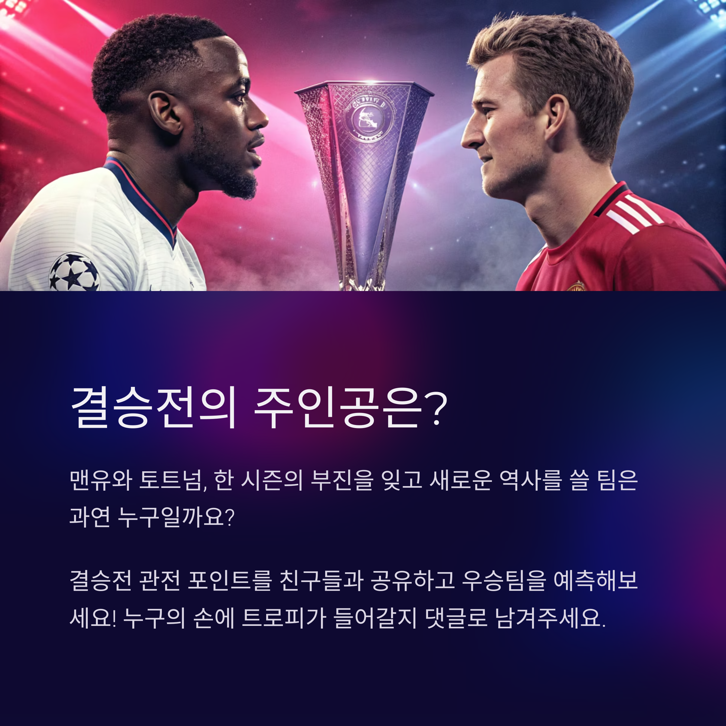 결승전은 두 팀의 완전히 대비되는 경기 스타일의 충돌로, 축구 팬들에게 매우 흥미로운 경기가 될 것입니다. 최근 상대 전적에서 우위를 가진 토트넘이 유리하지만, 맨유의 날카로운 공격력 또한 무시할 수 없는 요소입니다. 승리는 결국 전술적 세부 사항과 개인 기량, 그리고 경기 당일의 집중력에서 갈릴 것입니다.