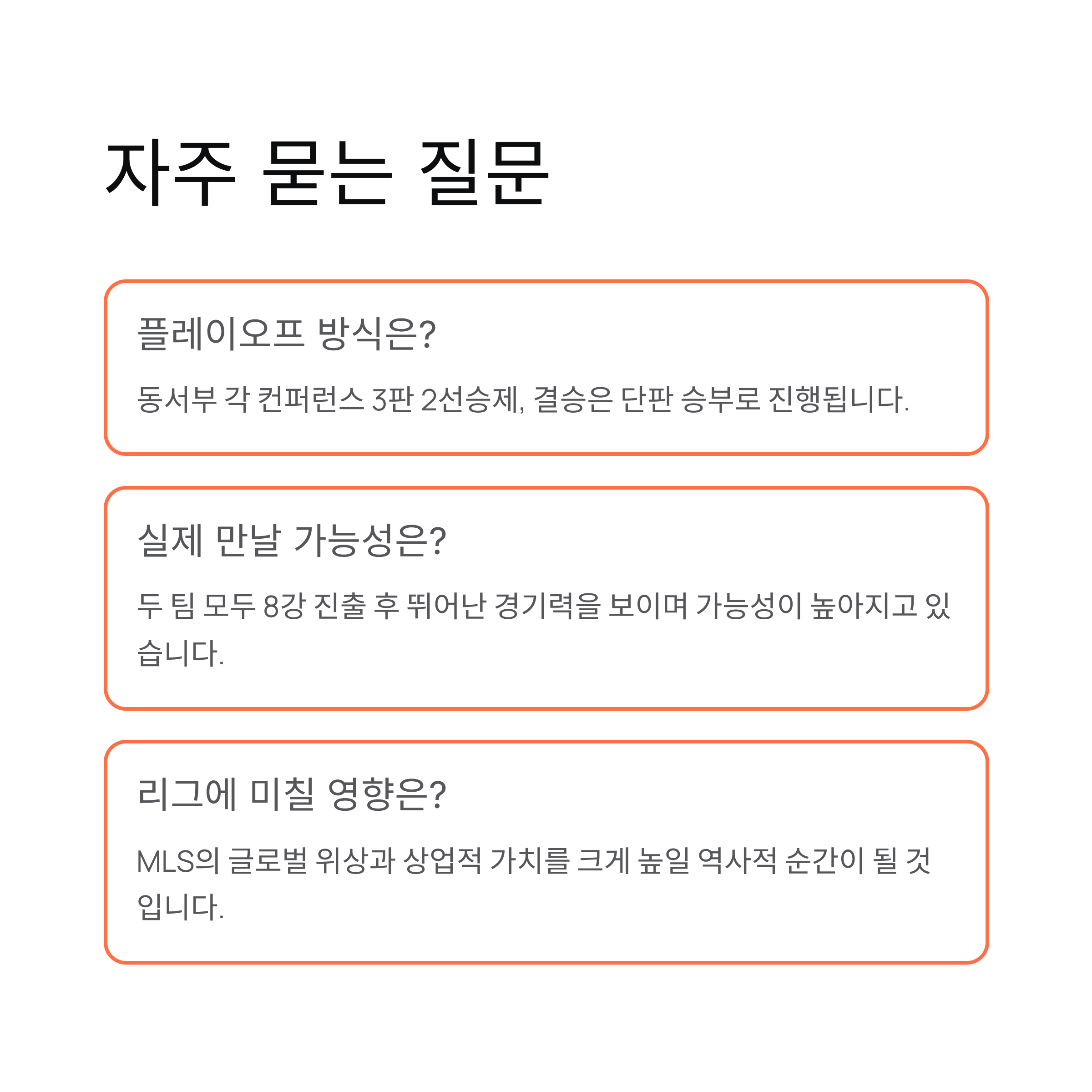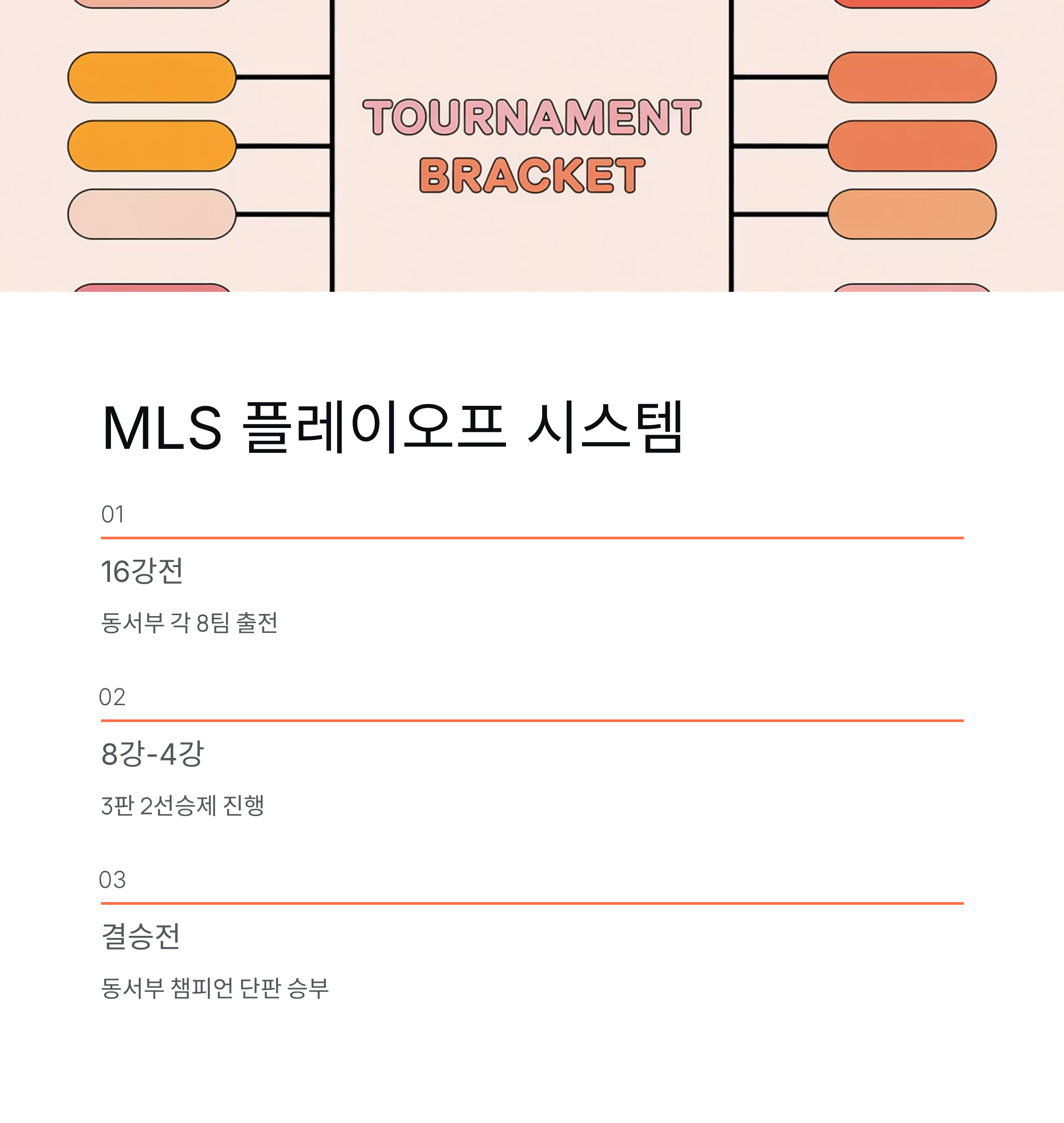 1. 메이저리그 사커(MLS) 플레이오프는 동서부 컨퍼런스 상위 8팀이 출전하는 토너먼트 형식으로 진행됩니다.