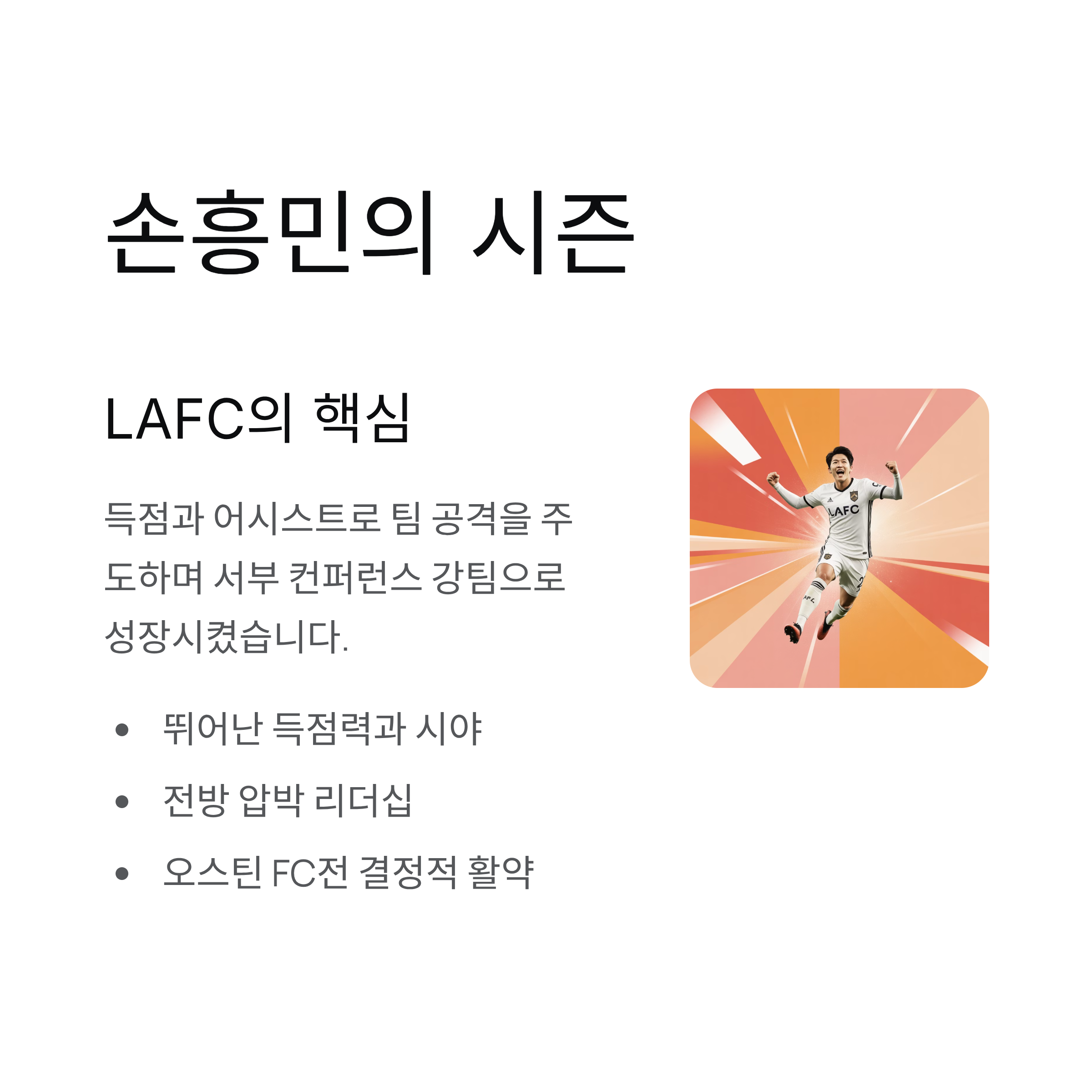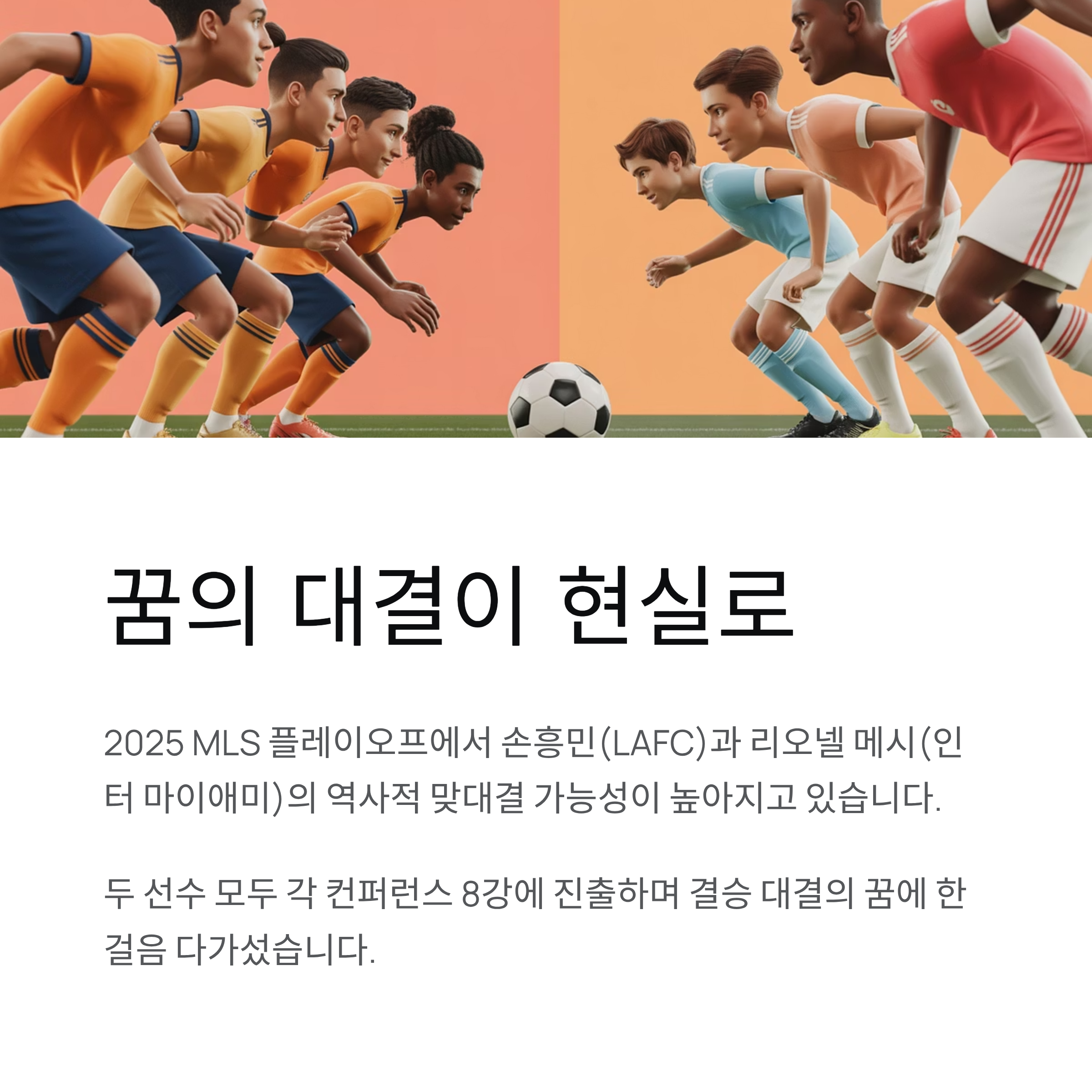 2025년 메이저리그 사커(MLS) 플레이오프 시즌이 열리며, 미국 프로축구 역사상 가장 뜨거운 대결로 기대되는 손우민(LAFC)과 리오넬 메시(인터 마이애미)의 맞대결 가능성이 주요 화두로 떠오르고 있습니다. 손우민은 빠른 스피드와 강력한 득점력을 바탕으로 서부 컨퍼런스에서 LAFC 팀을 8강으로 이끌었고, 메시 역시 전설적인 실력으로 인터 마이애미를 동부 컨퍼런스의 강력한 우승 후보로 만들며 치열한 경쟁을 주도하고 있습니다.