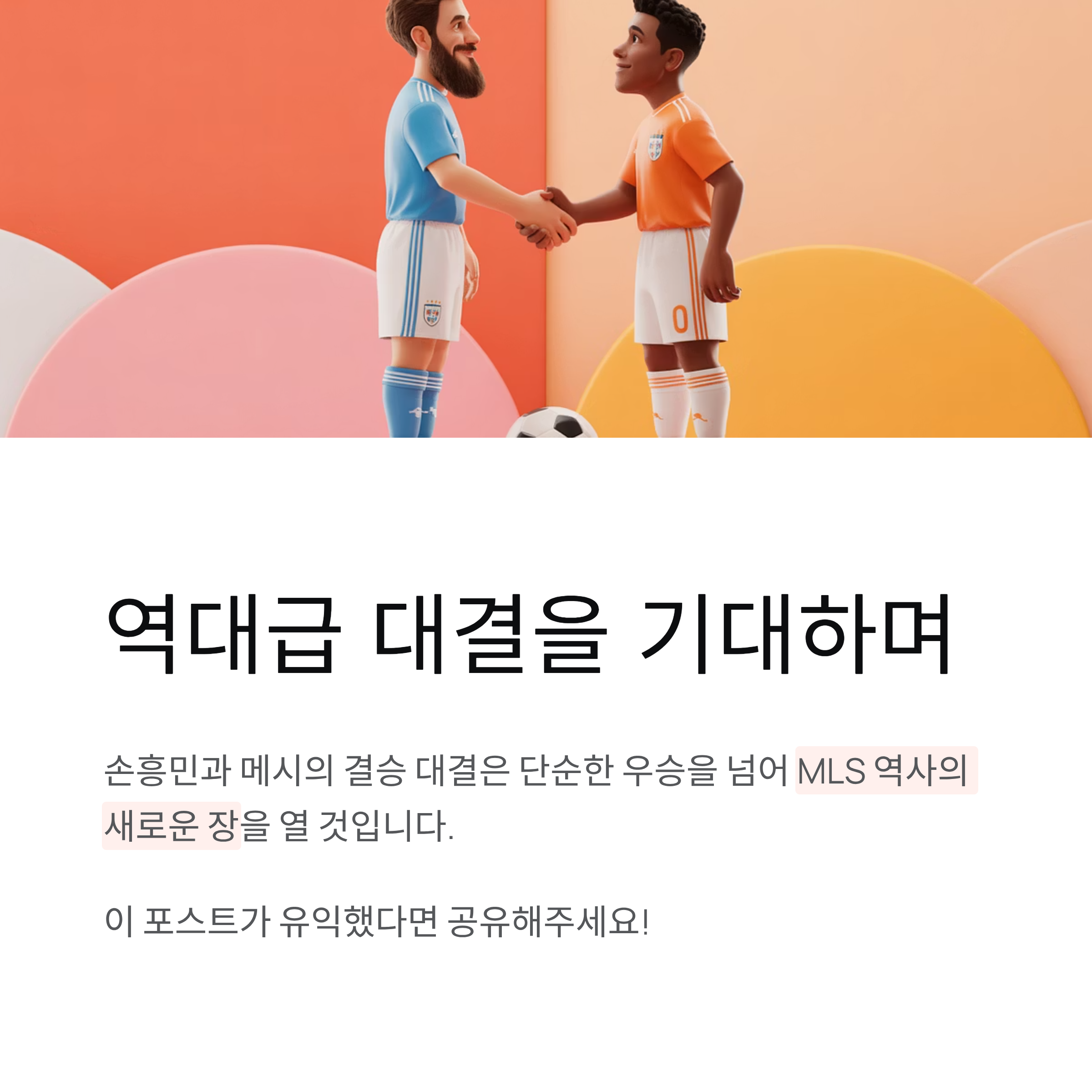 | A. 손우민과 메시의 결승전 대결은 MLS의 글로벌 위상을 높이는 데 큰 기여를 하며, 리그의 상업적 가치와 미래 관심도를 극대화할 것으로 기대됩니다. |