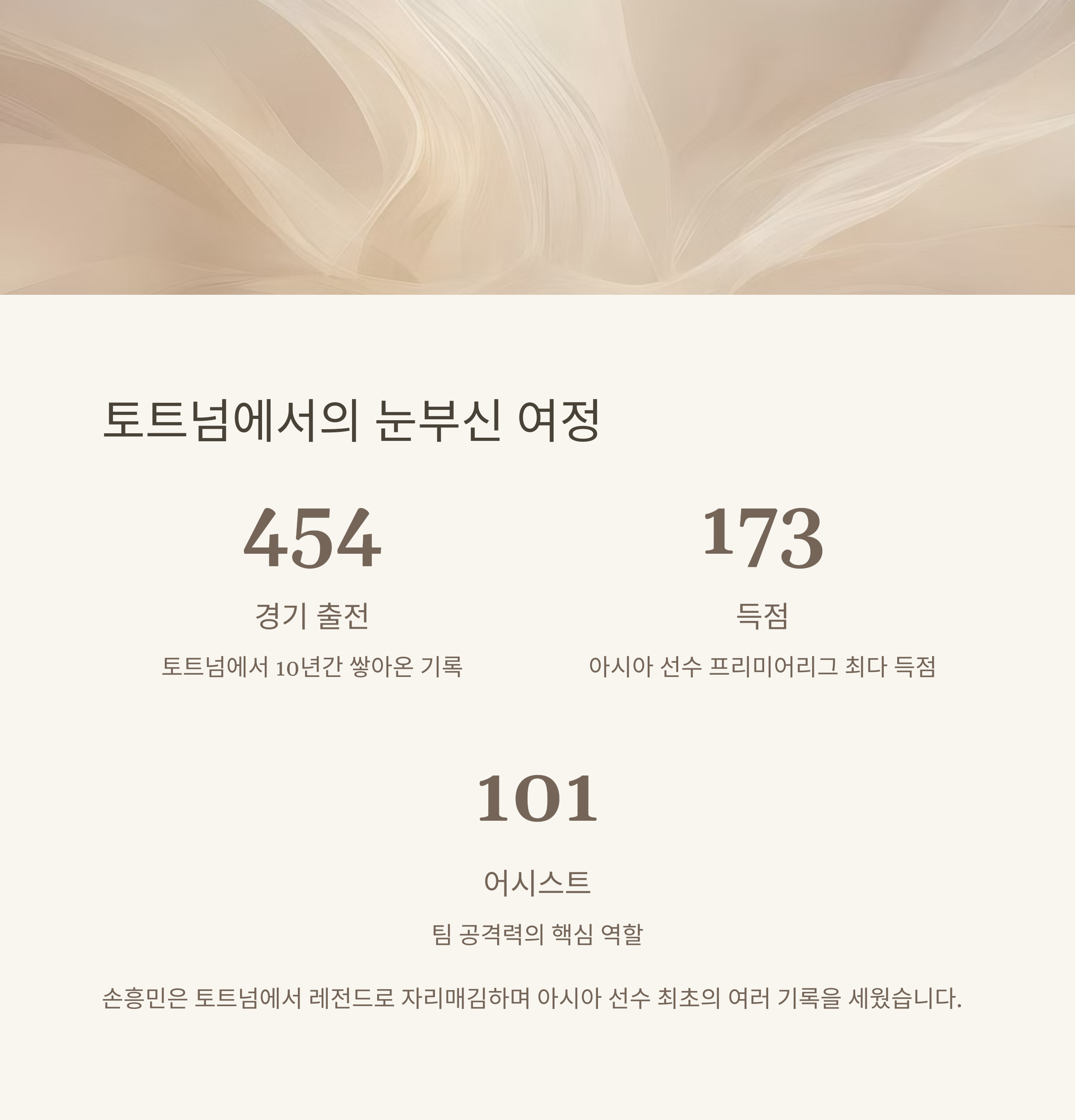 1. 손흥민은 토트넘에서 454경기 출전, 173골, 101도움을 기록하며 레전드로 자리매김했습니다.