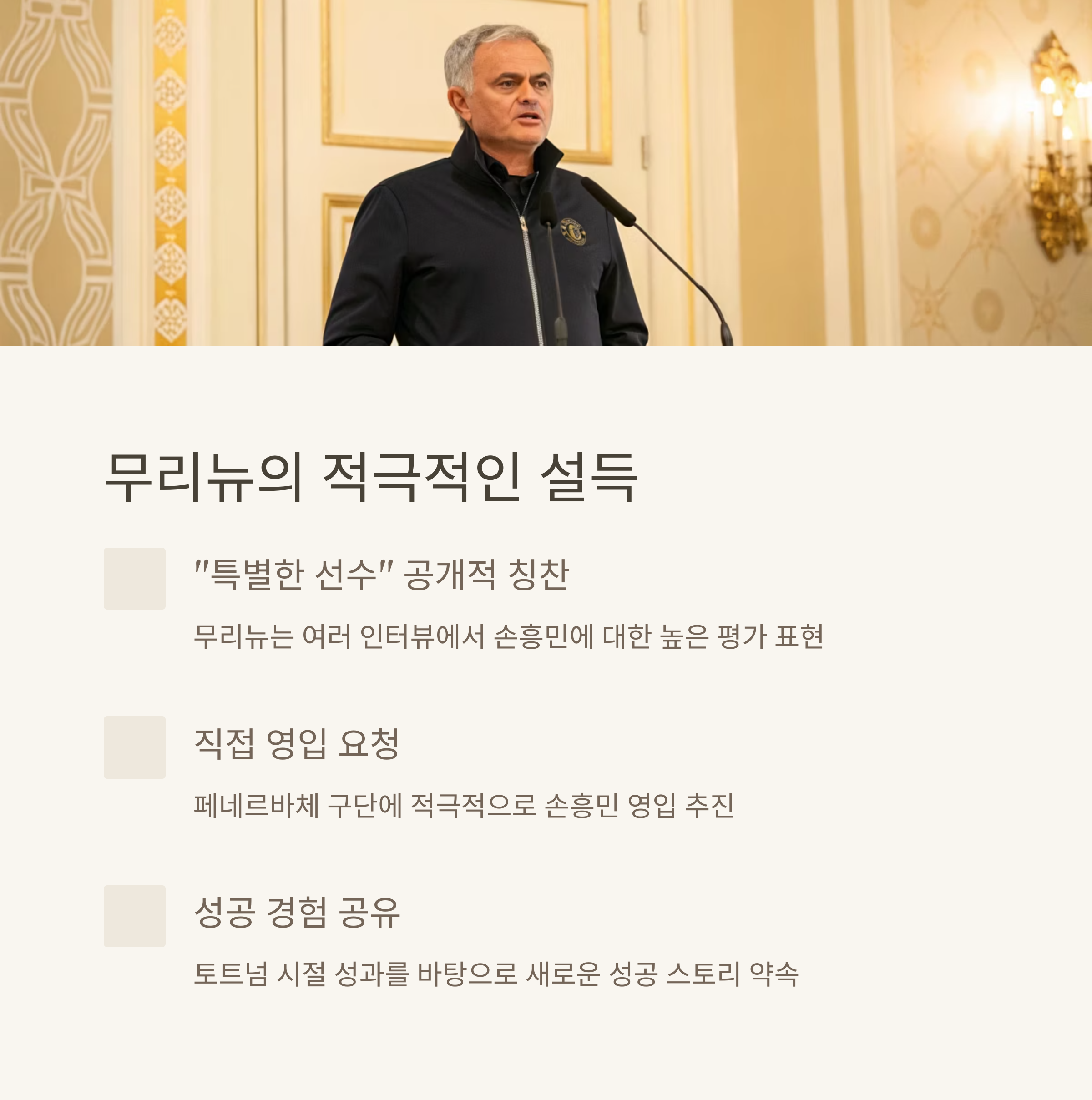 또한, 무리뉴 감독의 직접 설득 역시 강력한 요인으로 작용하고 있습니다. 무리뉴는 단순한 축구 이상으로, 한때 성공적이었던 사제관계를 플랫폼 삼아 손흥민을 다시 한 번 높은 자리로 올리겠다는 확신을 심어주고 있습니다.