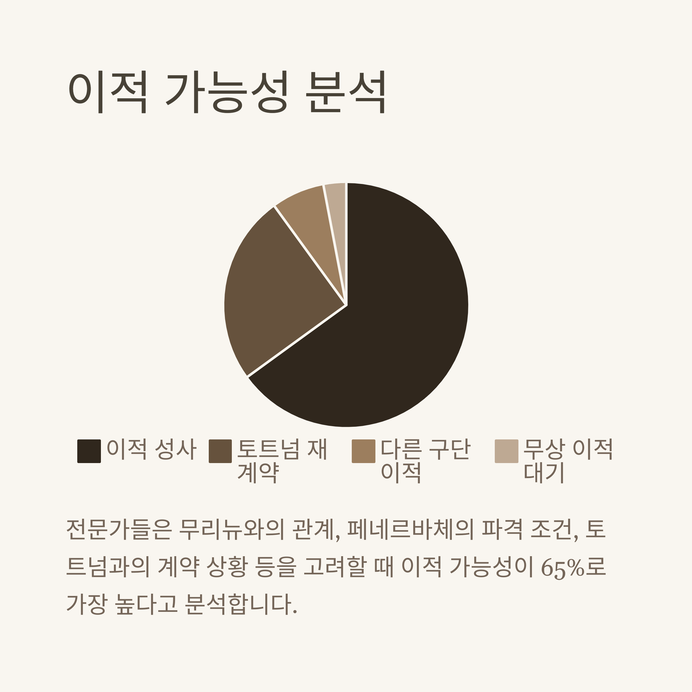 손흥민이 무리뉴 감독과 다시 재회하여 페네르바체에서 새로운 축구 여정을 시작할 가능성은 매우 높다는 분석이 주를 이룹니다. 특히 무리뉴의 확신과 페네르바체 측의 상당한 재정적·전략적 준비는 이번 이적설의 신뢰성을 높이고 있습니다.