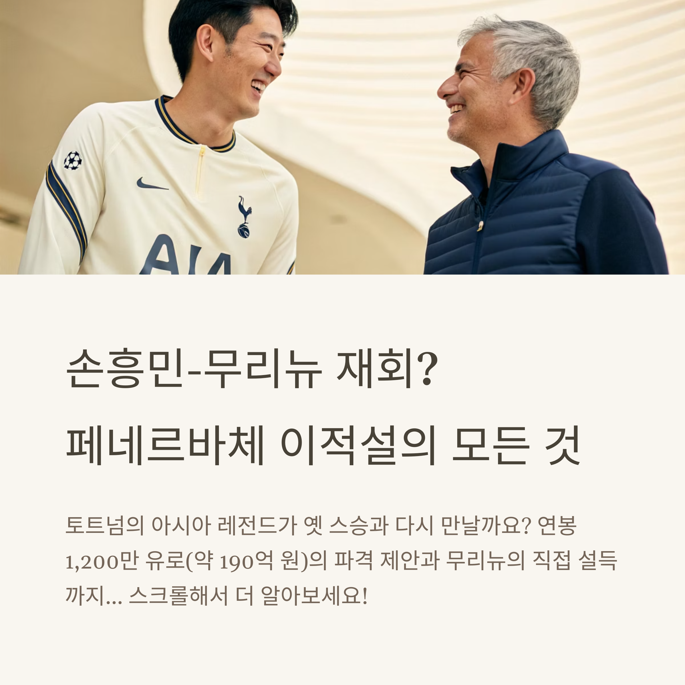 2025년 6월, 축구 시장에서는 손흥민의 페네르바체 이적설이 뜨겁게 떠오르고 있습니다. 손흥민은 토트넘에서 성공적인 10년의 세월을 보내며 아시아 선수로서는 독보적인 기록을 쌓아왔습니다. 하지만, 최근 유럽 언론과 현지 매체에서는 손흥민이 이적 시즌을 맞아 새로운 도전에 나설 가능성이 크다고 보도하고 있습니다. 이 중심에는 그의 옛 감독, 조세 무리뉴가 있습니다. 현재 페네르바체를 이끄는 무리뉴 감독은 손흥민의 영입을 공개적으로 요구하며 그와의 재회를 꿈꾸고 있습니다.