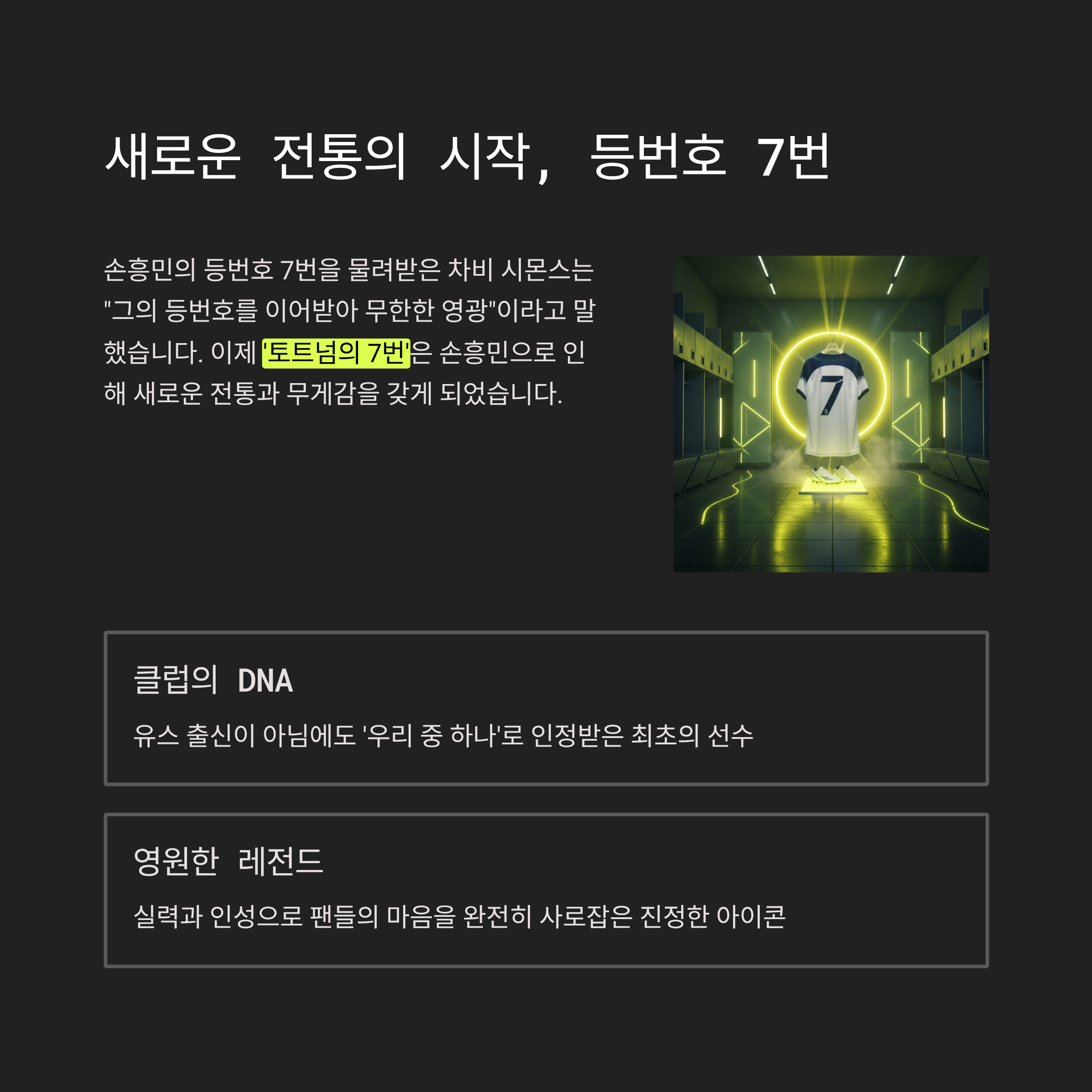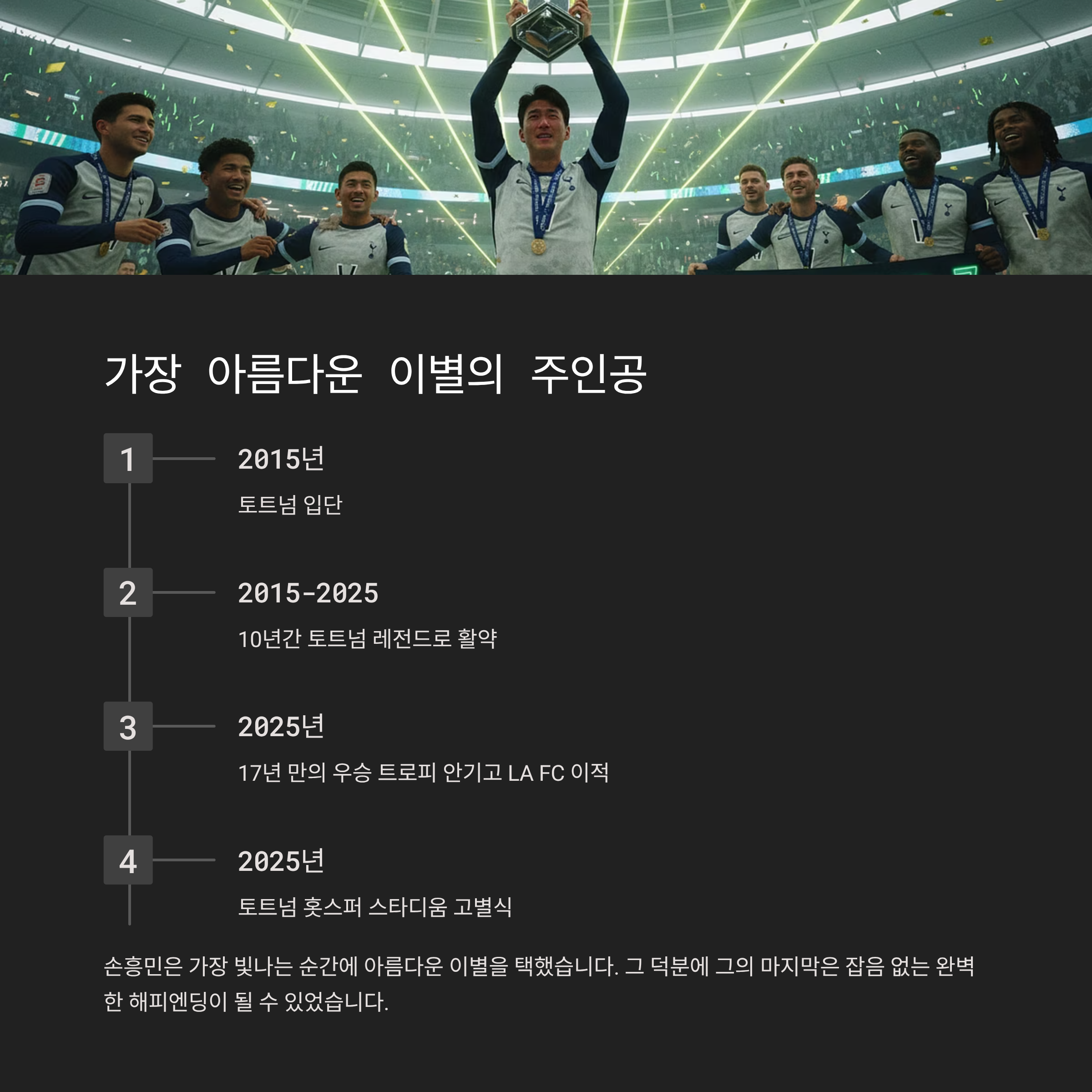 손흥민은 17년 만의 우승 트로피를 팀에 안기고 가장 빛나는 순간에 아름다운 이별을 택했습니다. 그 덕분에 그의 마지막은 잡음 없는 완벽한 해피엔딩이 될 수 있었고, 이는 "가장 아름다운 이별의 주인공"이라는 현지 팬의 평가로 이어졌습니다. 그의 등번호 7번을 물려받은 차비 시몬스가 "그의 등번호를 이어받아 무한한 영광"이라고 말했듯, 이제 '토트넘의 7번'은 손흥민으로 인해 새로운 전통과 무게감을 갖게 되었습니다. 손흥민의 이번 방문과 그를 둘러싼 모든 반응은, 그가 단순히 뛰어난 축구 선수를 넘어 사람들의 마음을 움직이고, 인종과 국경의 벽을 넘어 하나의 상징이 되었음을 증명한 순간으로 영원히 기억될 것입니다.