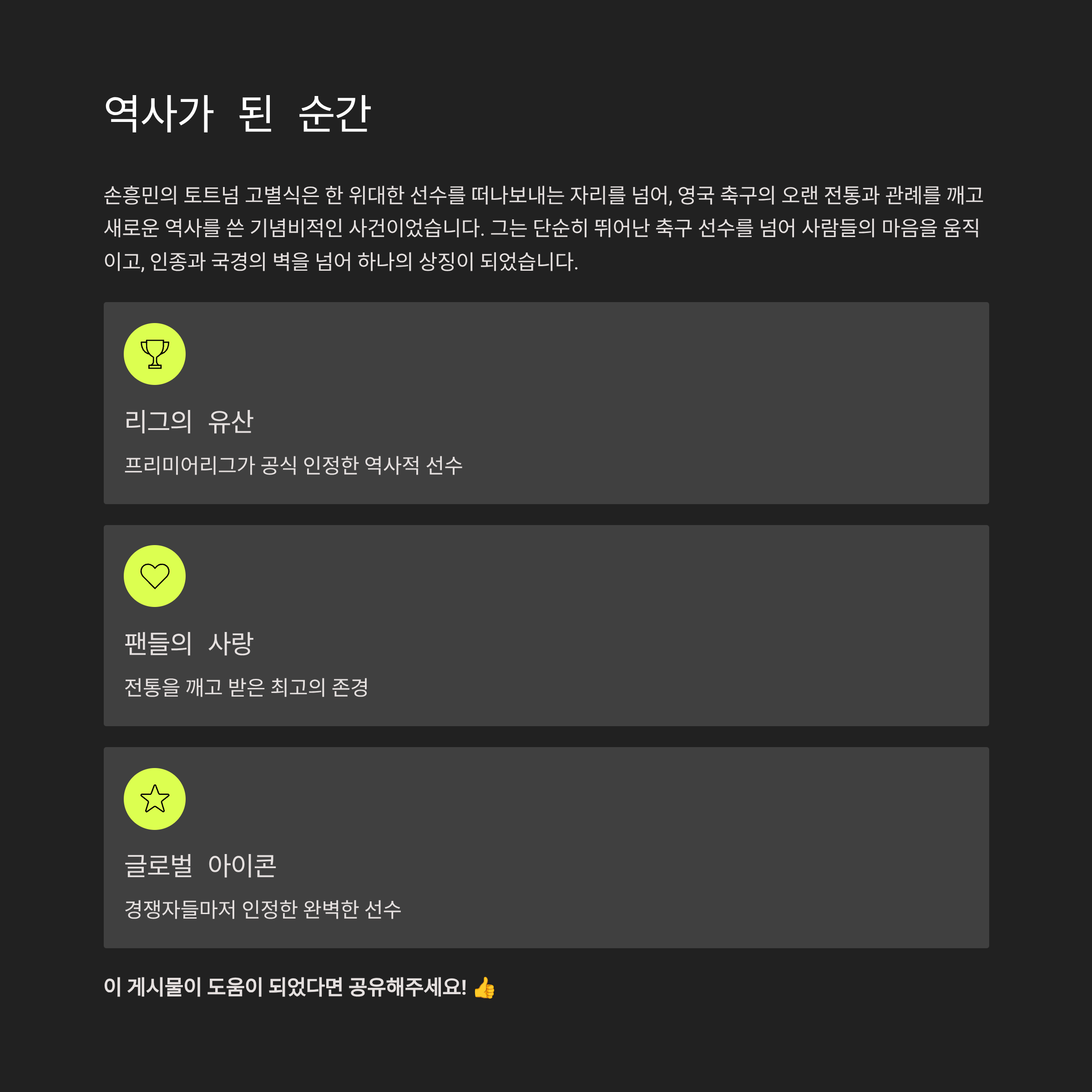 프리미어리그의 공식 헌사: 프리미어리그(PL) 사무국은 이례적으로 장문의 특집 기사를 통해 손흥민을 '토트넘의 레전드'를 넘어 '프리미어리그의 유산(Legacy)'이라고 칭송했습니다.