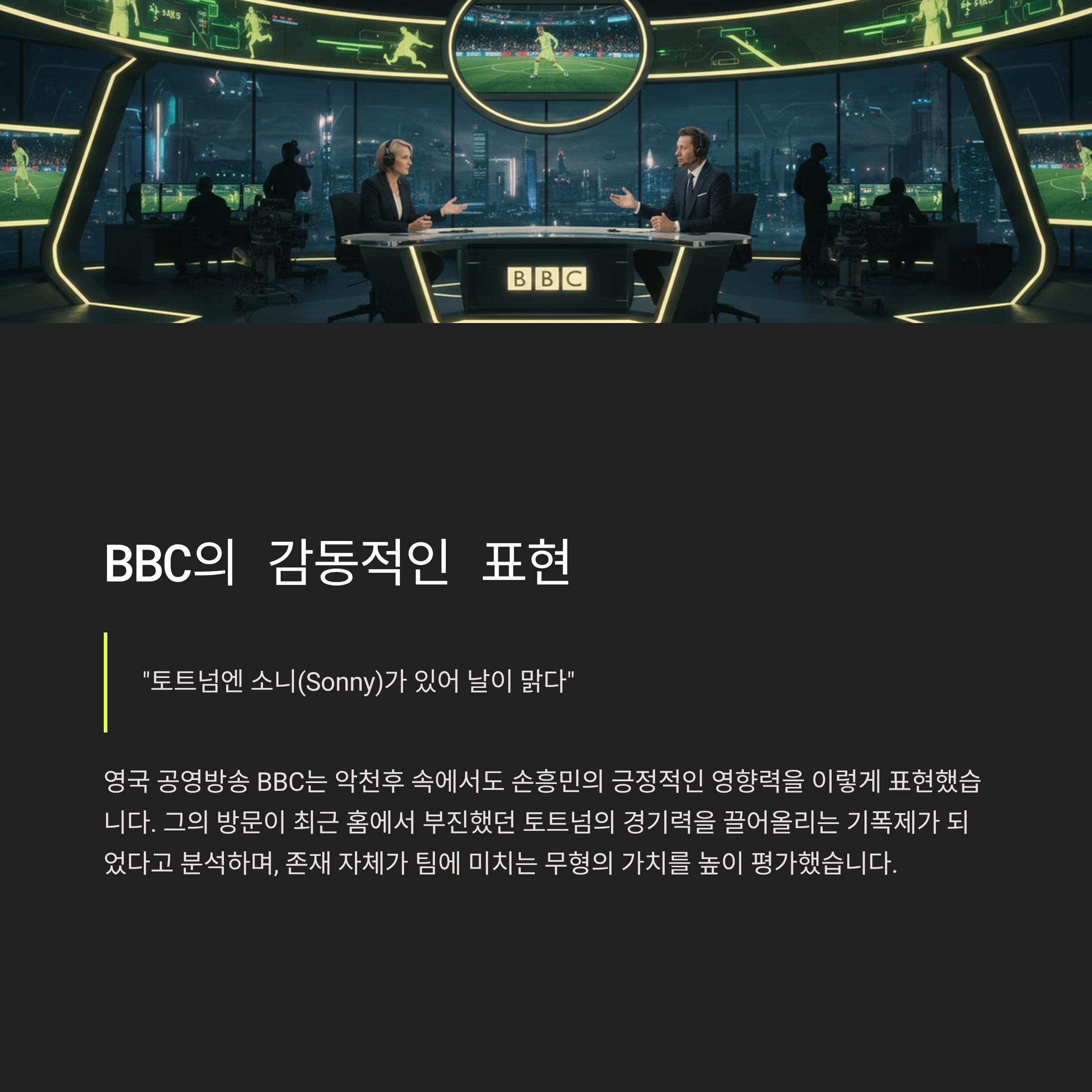 이러한 평가는 비단 공식 기록에만 머무르지 않았습니다. 영국 공영방송 BBC는 악천후 속에서도 "토트넘엔 소니(Sonny)가 있어 날이 맑다"라는 재치 있는 표현으로 그의 긍정적인 영향력을 조명했습니다. 또한, 손흥민의 방문과 고별식이 최근 홈에서 부진했던 토트넘의 경기력을 끌어올리는 기폭제가 되었다고 분석하며, 그의 존재 자체가 팀에 미치는 무형의 가치를 높이 평가했습니다. 한 선수의 작별 행사를 리그 전체의 자산으로 여기고 집중 조명하는 것은 그가 남긴 발자취가 얼마나 깊고 위대했는지를 보여주는 명백한 증거입니다.