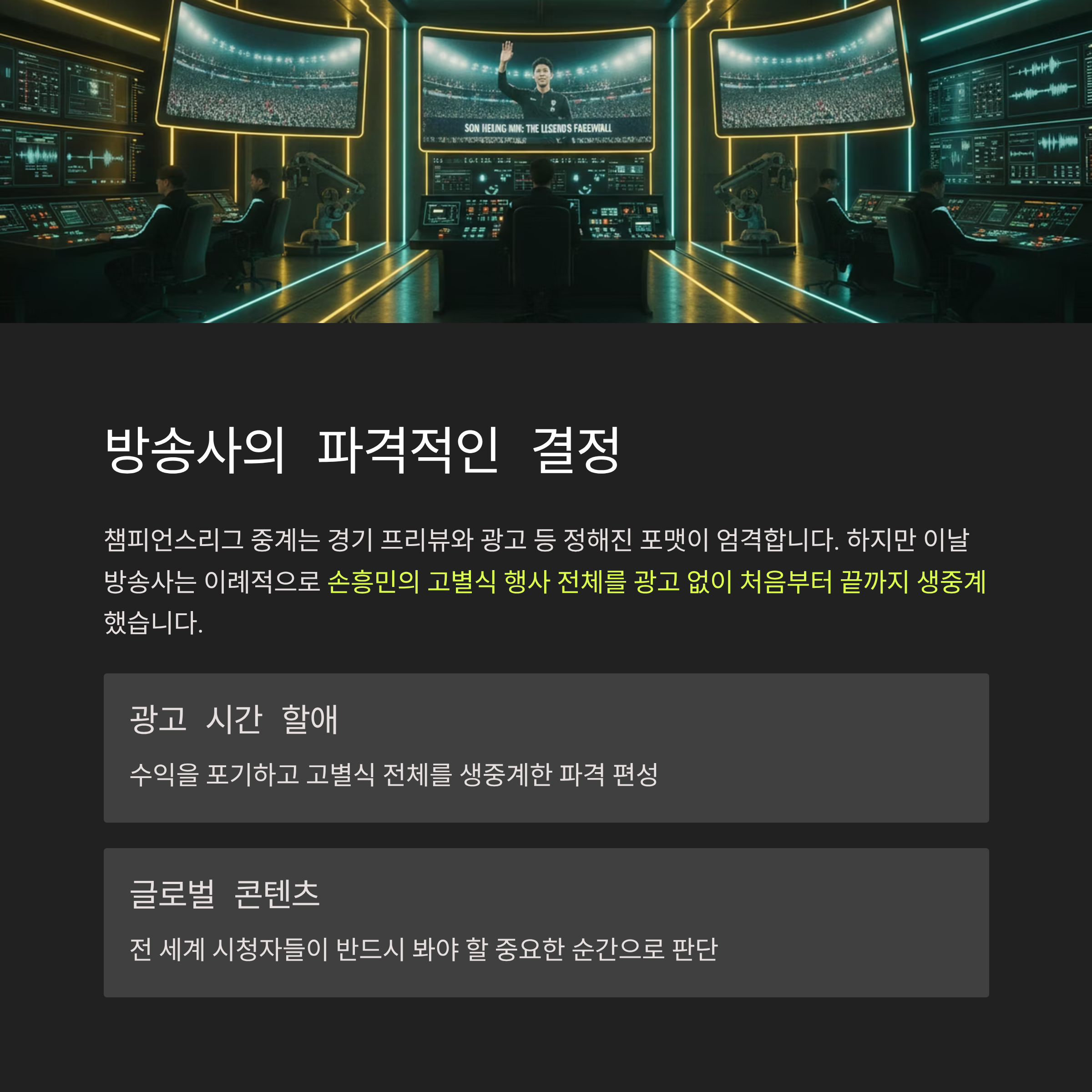 방송사의 태도 또한 파격적이었습니다. 챔피언스리그 중계는 경기 프리뷰와 광고 등 정해진 포맷이 엄격하지만, 이날 방송사는 이례적으로 손흥민의 고별식 행사 전체를 광고 없이 처음부터 끝까지 생중계했습니다. 이는 방송사가 손흥민의 고별식이 전 세계 시청자들이 반드시 봐야 할 중요한 콘텐츠라고 판단했기 때문입니다. 전 토트넘 감독 글렌 호들 역시 "손흥민이 라커룸에 들러 선수들을 격려했고, 선수들은 '소니를 위해 이기자'고 다짐했을 것"이라고 해설하며, 그의 존재가 팀에 승리의 동기를 부여했다고 분석했습니다. 이처럼 라이벌과 미디어의 전폭적인 존중은 손흥민이 실력, 인성, 스타성을 모두 갖춘 대체 불가능한 글로벌 아이콘임을 입증합니다.