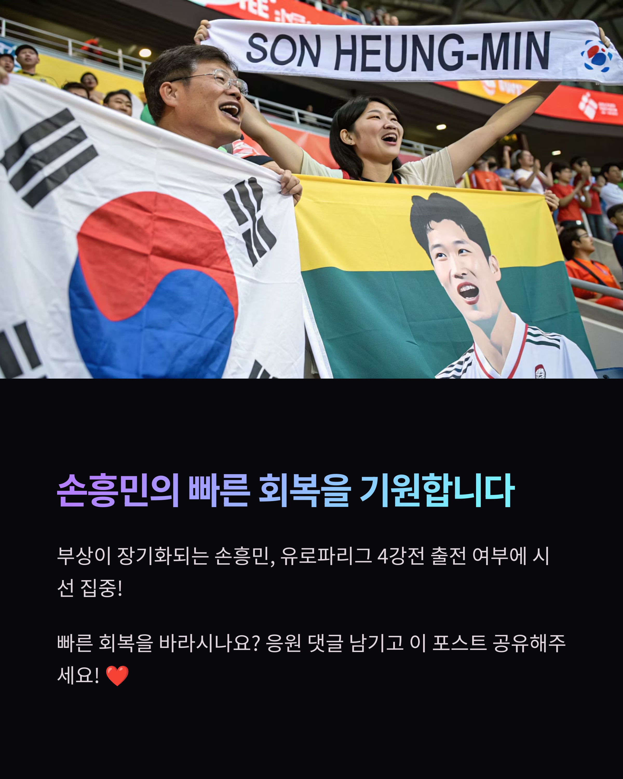팬들과 구단은 그의 빠른 회복을 기다리며 지속적으로 기대감을 높이고 있으며, 손흥민 또한 복귀 의지를 강하게 드러내고 있습니다. 그는 팀 전력의 필수적인 일부로, 그의 복귀가 토트넘의 유럽 내 입지를 확장하는 데 얼마나 중요한 역할을 할지 확실히 증명할 것입니다.