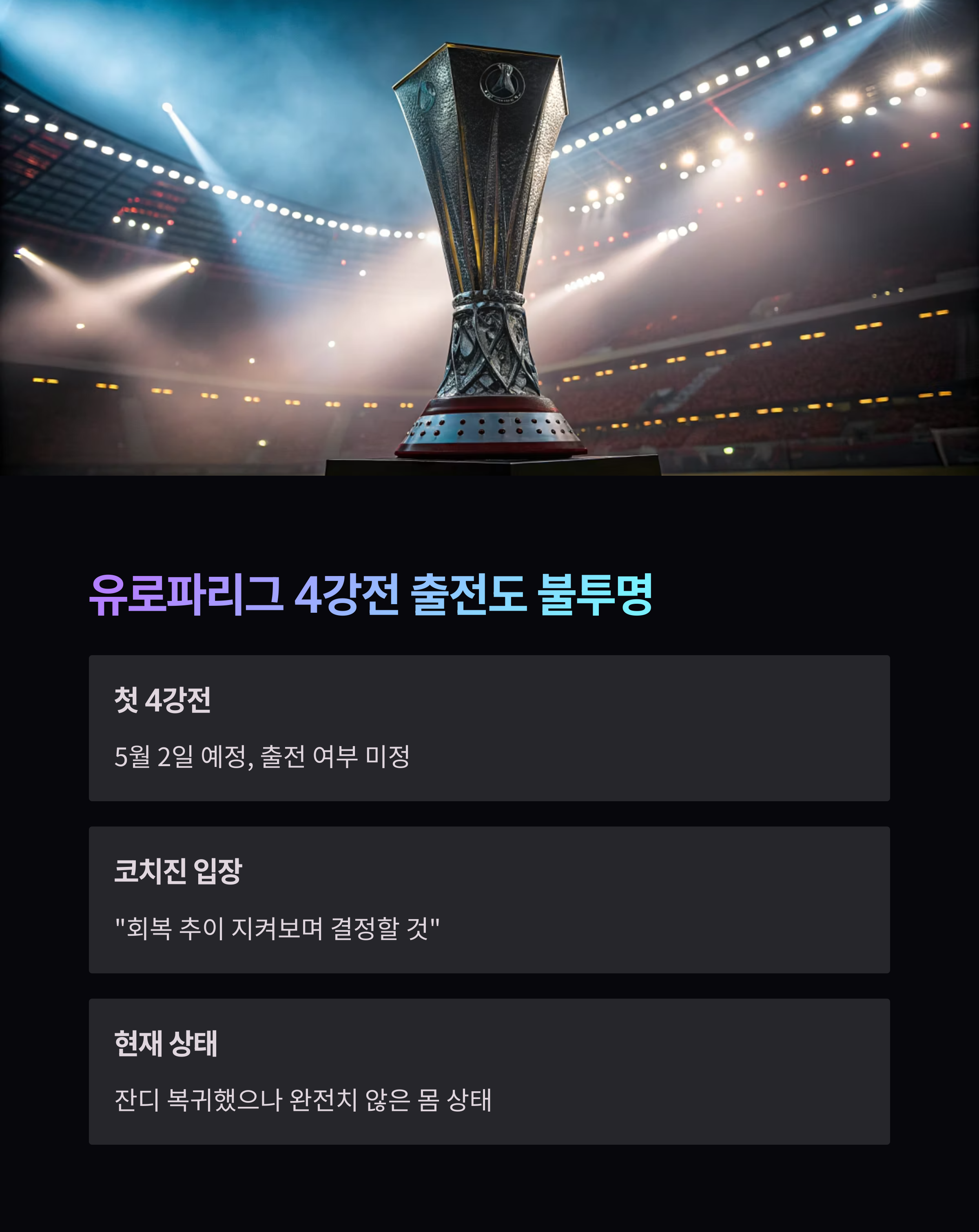 - 그의 부상이 예상보다 회복이 느려, 유로파리그 4강전 출전 가능성도 불투명합니다.