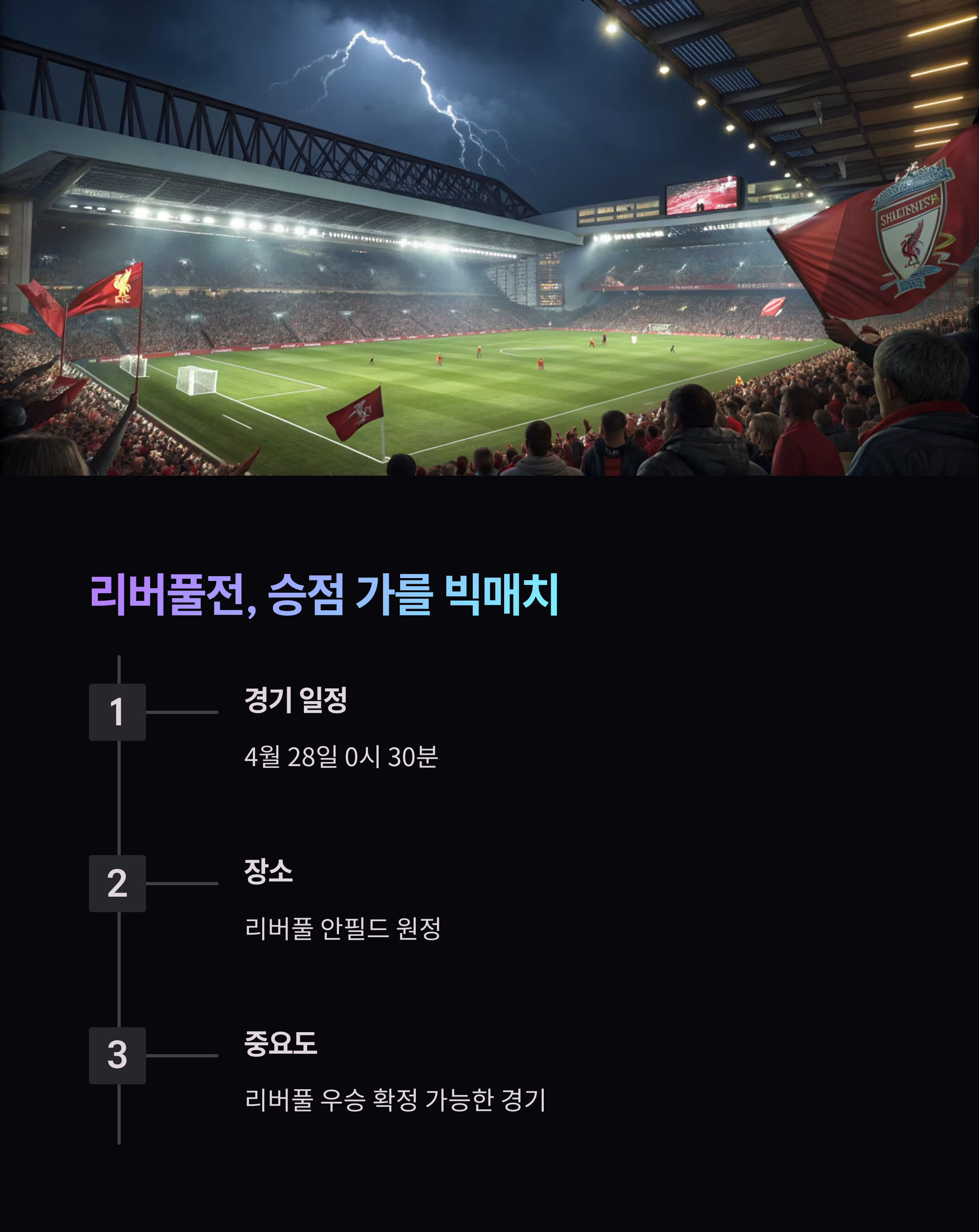 - 리버풀과의 경기는 한국 시간으로 4월 28일 오후 0시 30분, 안필드에서 진행됩니다.