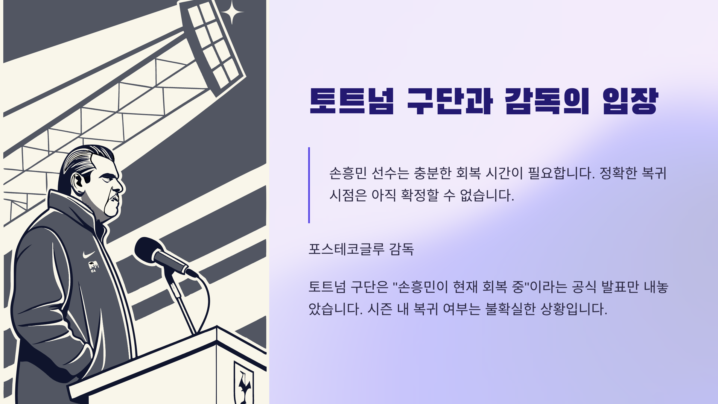 - 토트넘 구단과 포스테코글루 감독은 손흥민의 복귀 시기가 불확실하다고 발표.
