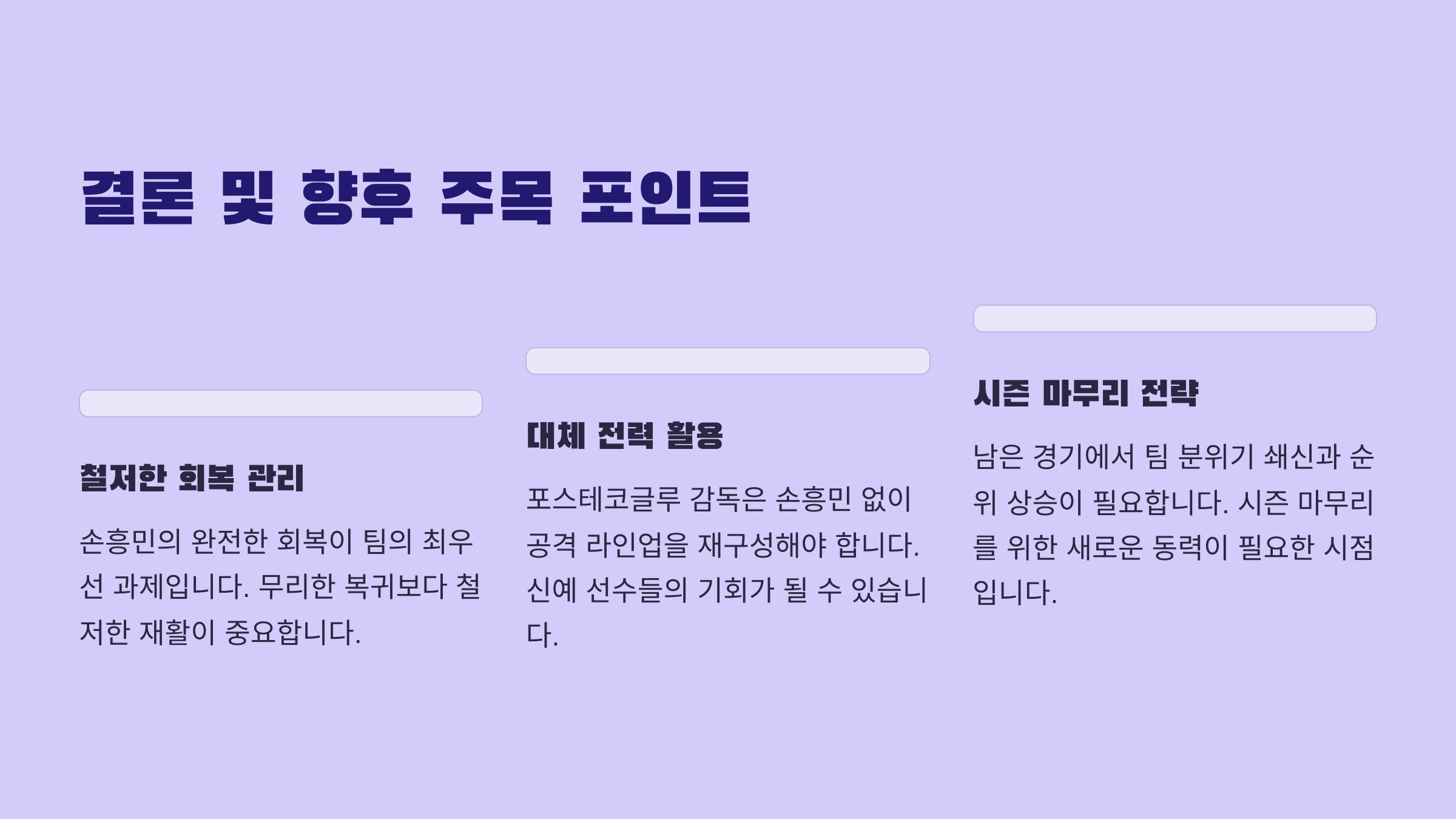 더불어, 손흥민의 부상에 대한 불확실성은 시즌 중반의 토트넘 경기 일정에서 중요한 변수가 될 전망입니다. 이는 리그 승점 획득 경쟁에서의 후퇴나 후속 젊은 선수들에게 기회로 전환될 가능성을 결정짓는 변곡점이 될 것입니다.