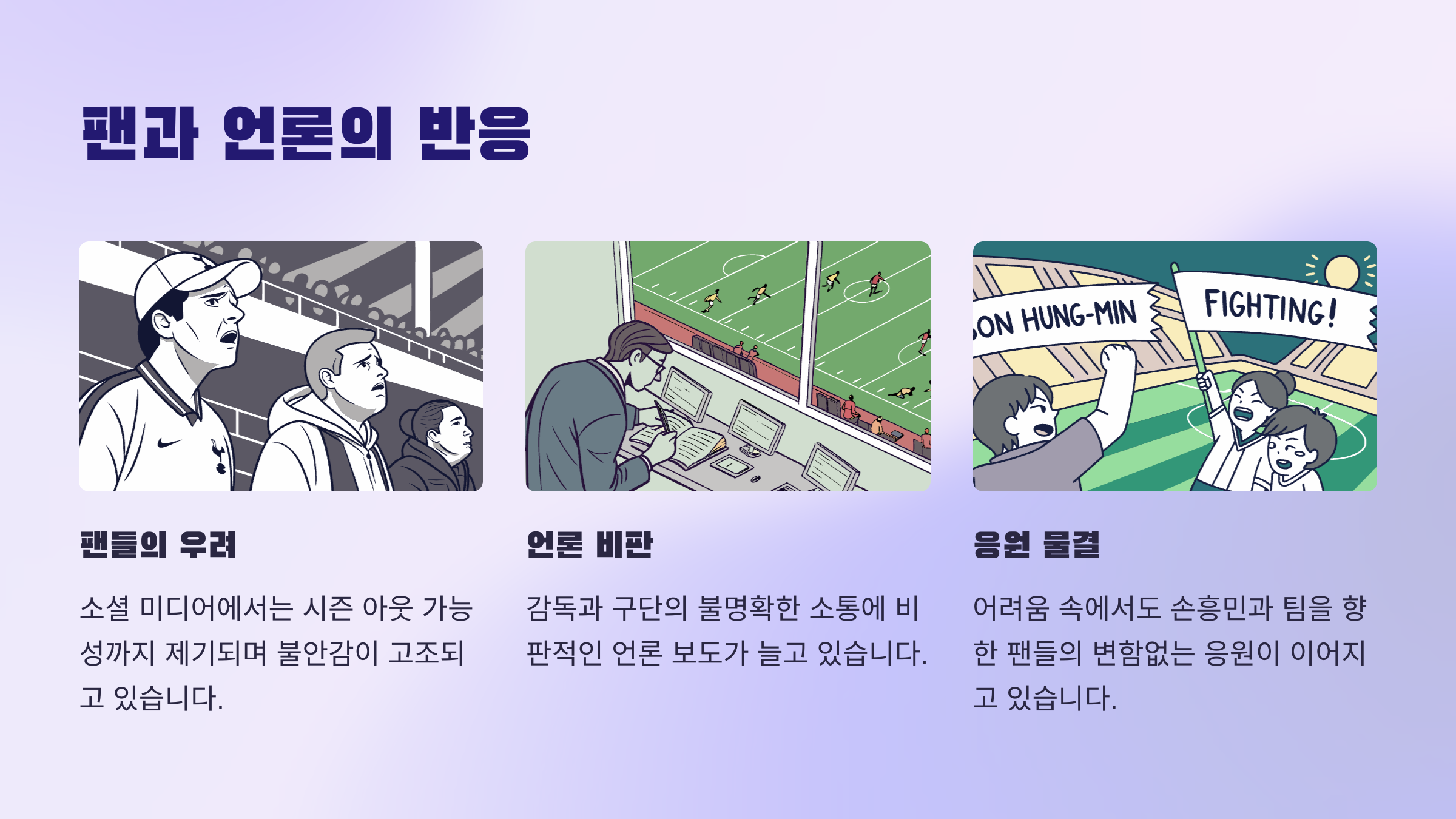 손흥민의 결장은 경기장 내부뿐만 아니라 경기장 외부 팬덤과 팀 내 사기에까지 영향을 주고 있습니다. 손흥민은 팀의 리더로서 팬들과 팀 동료들 모두에게 심리적 의지처가 되었던 존재인데요, 그의 부재는 팬 지원 감소와 선수단 내 사기 저하로 이어질 수 있습니다.