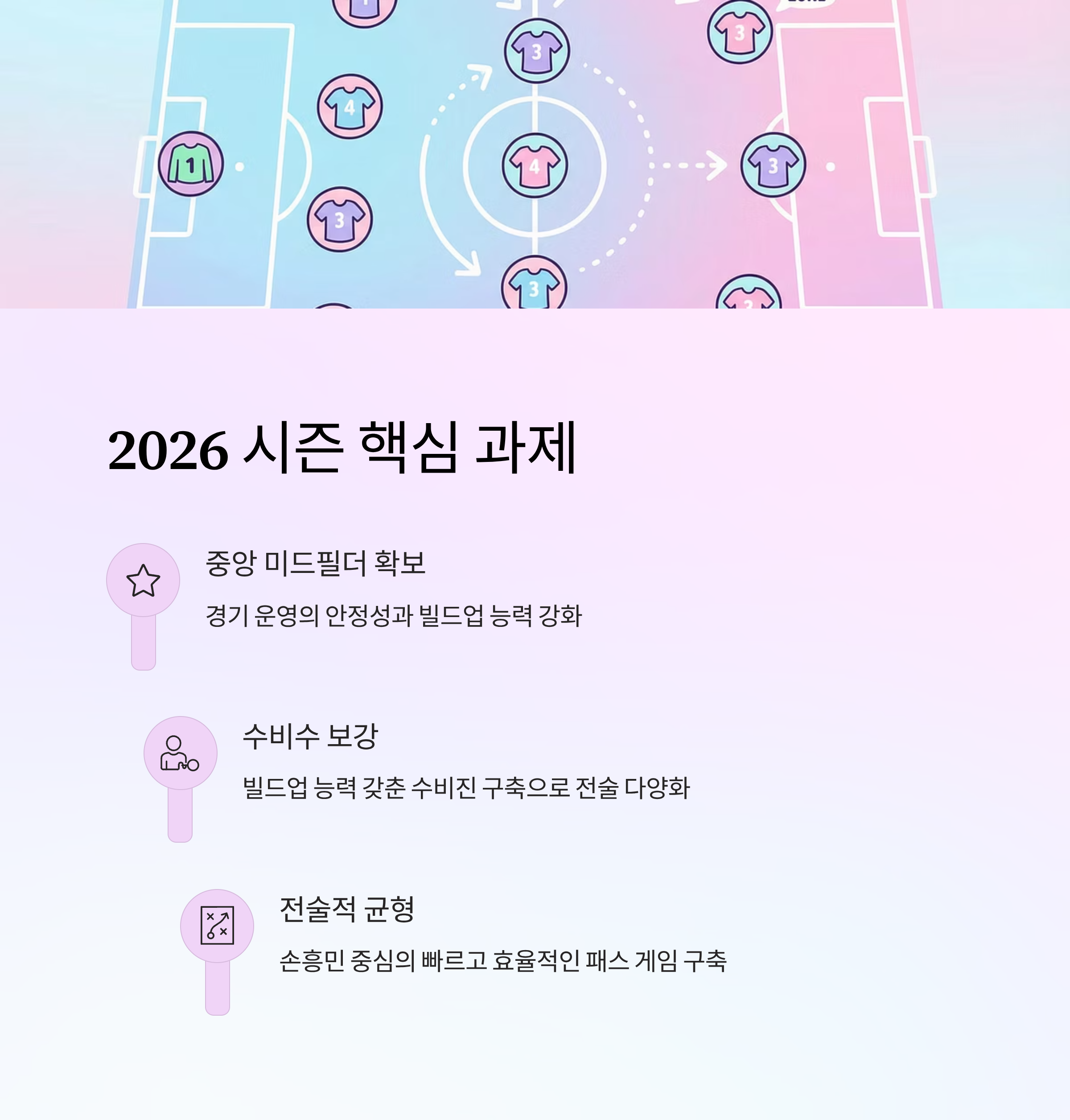 중앙 미드필더와 수비진 보강이 2026시즌 우승을 위한 주요 과제로 떠오르고 있습니다.
