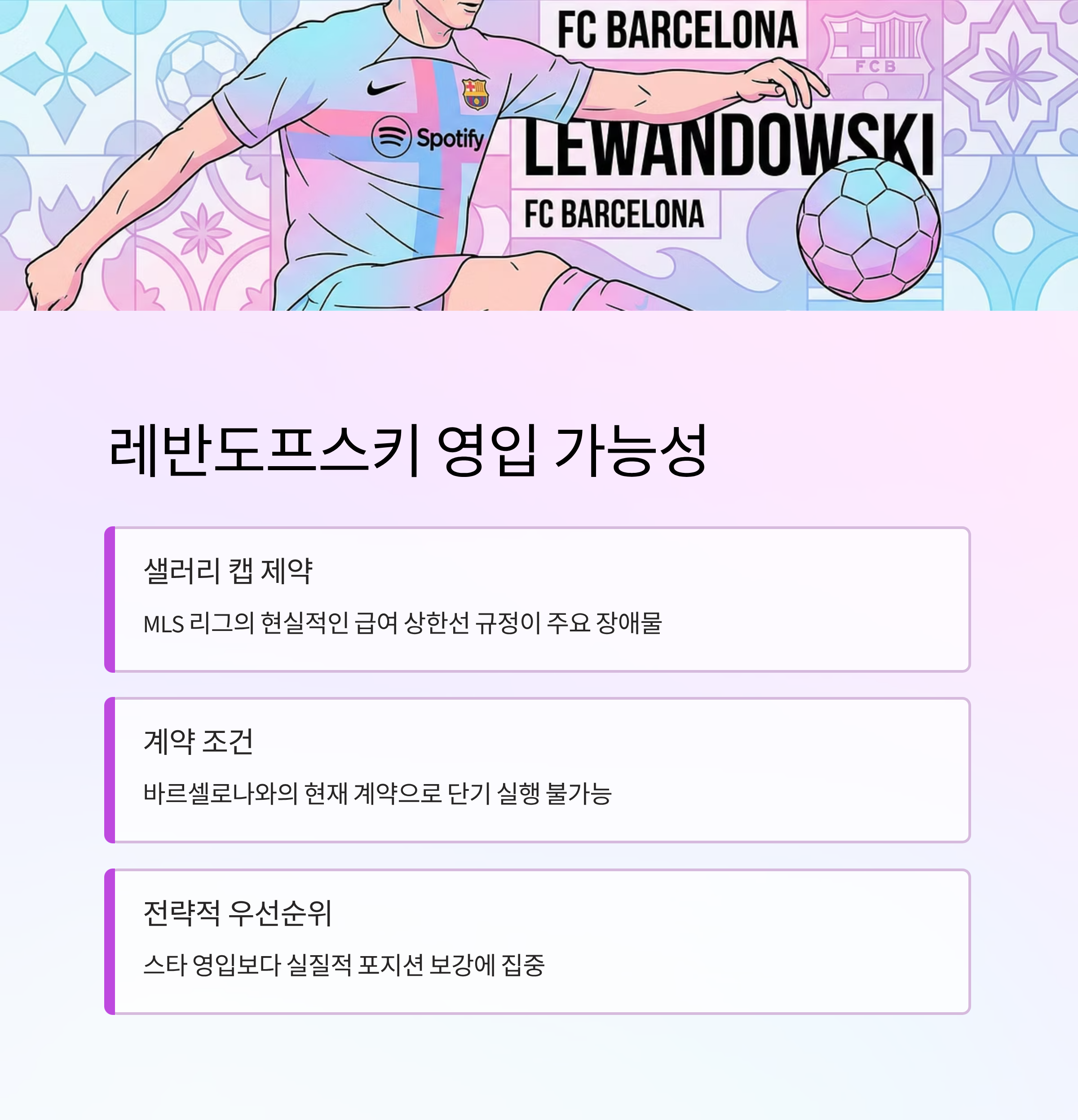 일부 언론에서 제기된 레반도프스키 영입설은 현실성과 제약으로 인해 가능성이 낮게 평가되었습니다.