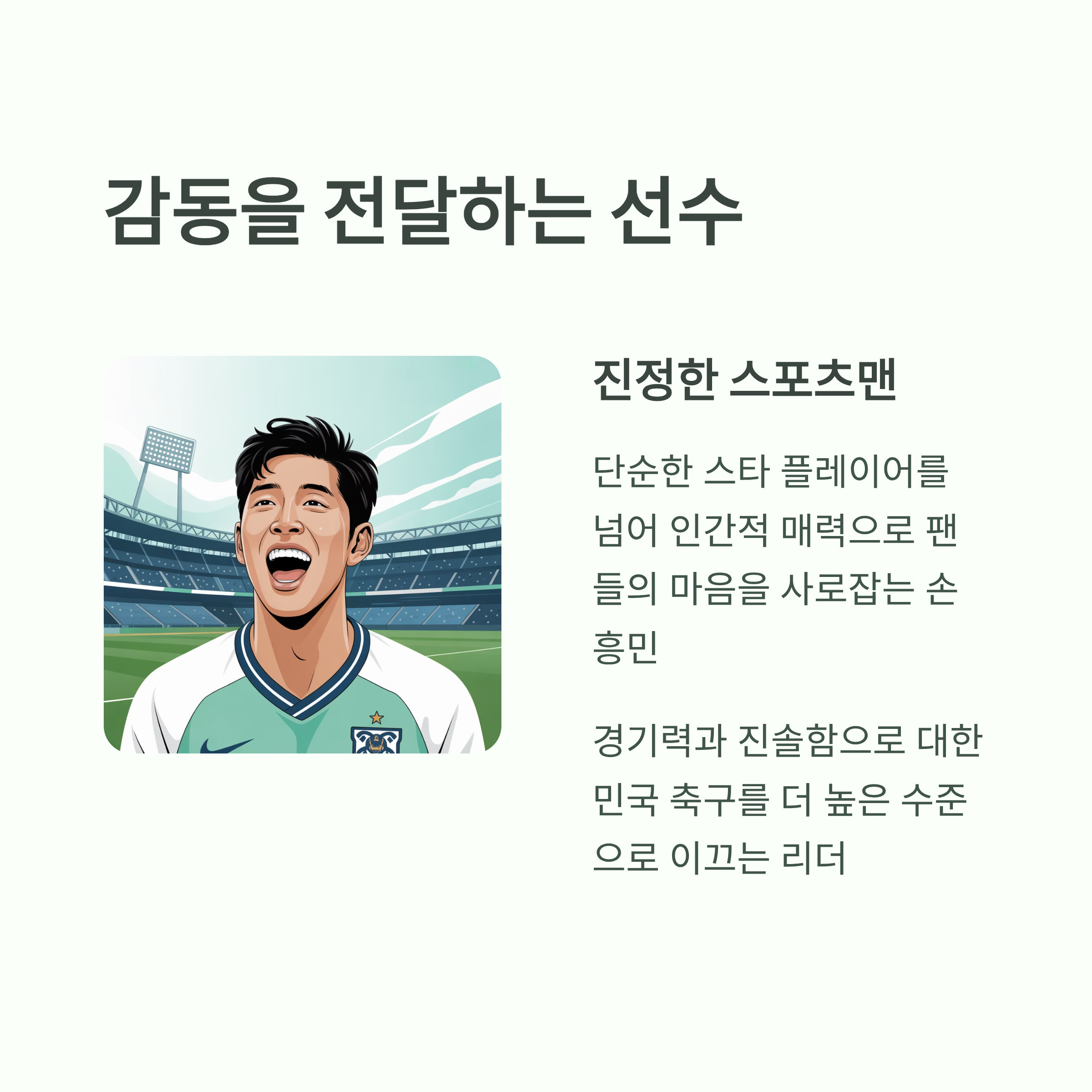 손흥민은 단순한 축구 스타를 넘어 진정성 있는 인간적인 매력을 지닌 드문 인물입니다. 그의 인터뷰 내용을 종합하며, 그는 현재 소속팀과 대표팀 모두에서 본분을 다하며 팀과 팬들에게 헌신하는 모습을 보여줍니다. 특히 팬들과 경기력으로 소통하려는 태도, 동료의 장점을 극대화하기 위한 노력 등은 손흥민을 '팀 전체를 빛내는 선수'로 만드는 특징 중 하나입니다.