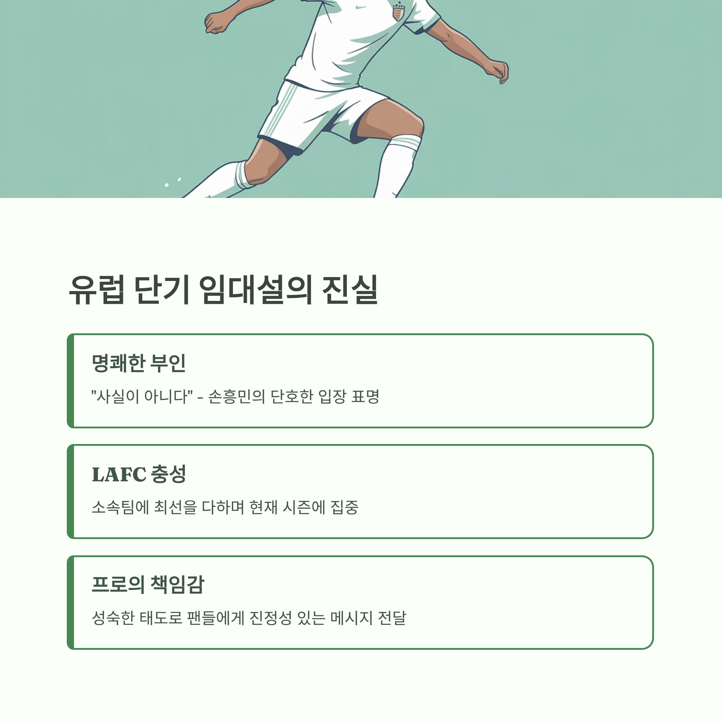 최근 제기된 손흥민의 유럽 리그 단기 임대설은 많은 팬들의 궁금증을 자아냈습니다. 그러나 손흥민은 이에 대해 단호하게 "사실이 아니다"라는 입장을 밝혔습니다. 그는 소속팀 LAFC에 최선을 다하며, 현재 시즌에 대한 집중도를 강조했습니다. 이 발언은 그의 프로페셔널함과 성숙한 태도를 보여주며 스포츠맨으로서의 철저한 책임감을 뒷받침합니다.