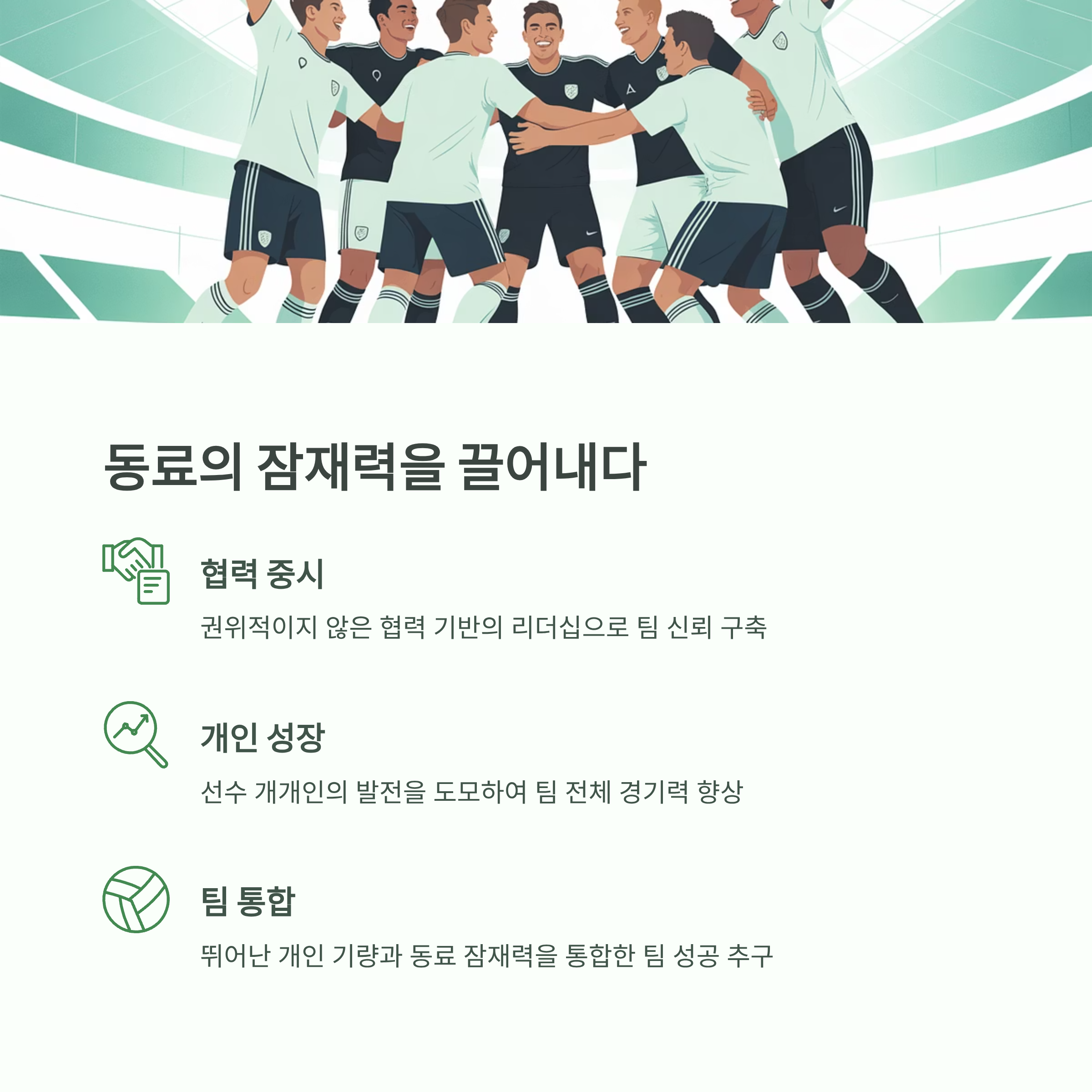 그의 이러한 접근은 단순히 권위적인 리더십이 아니라 주변의 협력을 중시하는 '서번트 리더십'과 맞닿아 있습니다. 이는 동료와의 신뢰를 바탕으로 경기를 더 효율적으로 이끌고, 선수 개개인의 성장을 도모해 팀의 경기력을 높이는 데 있어 중요한 역할을 합니다.