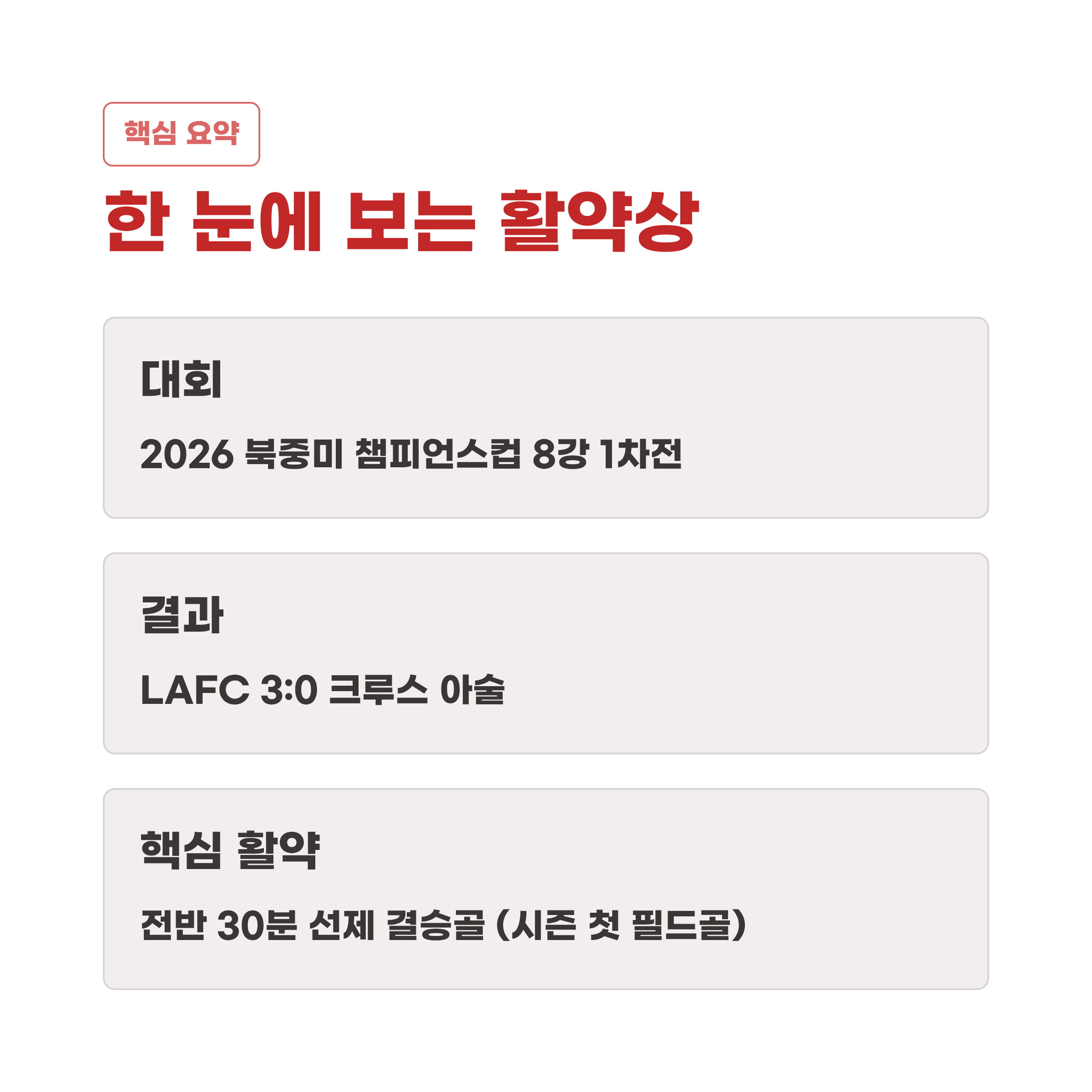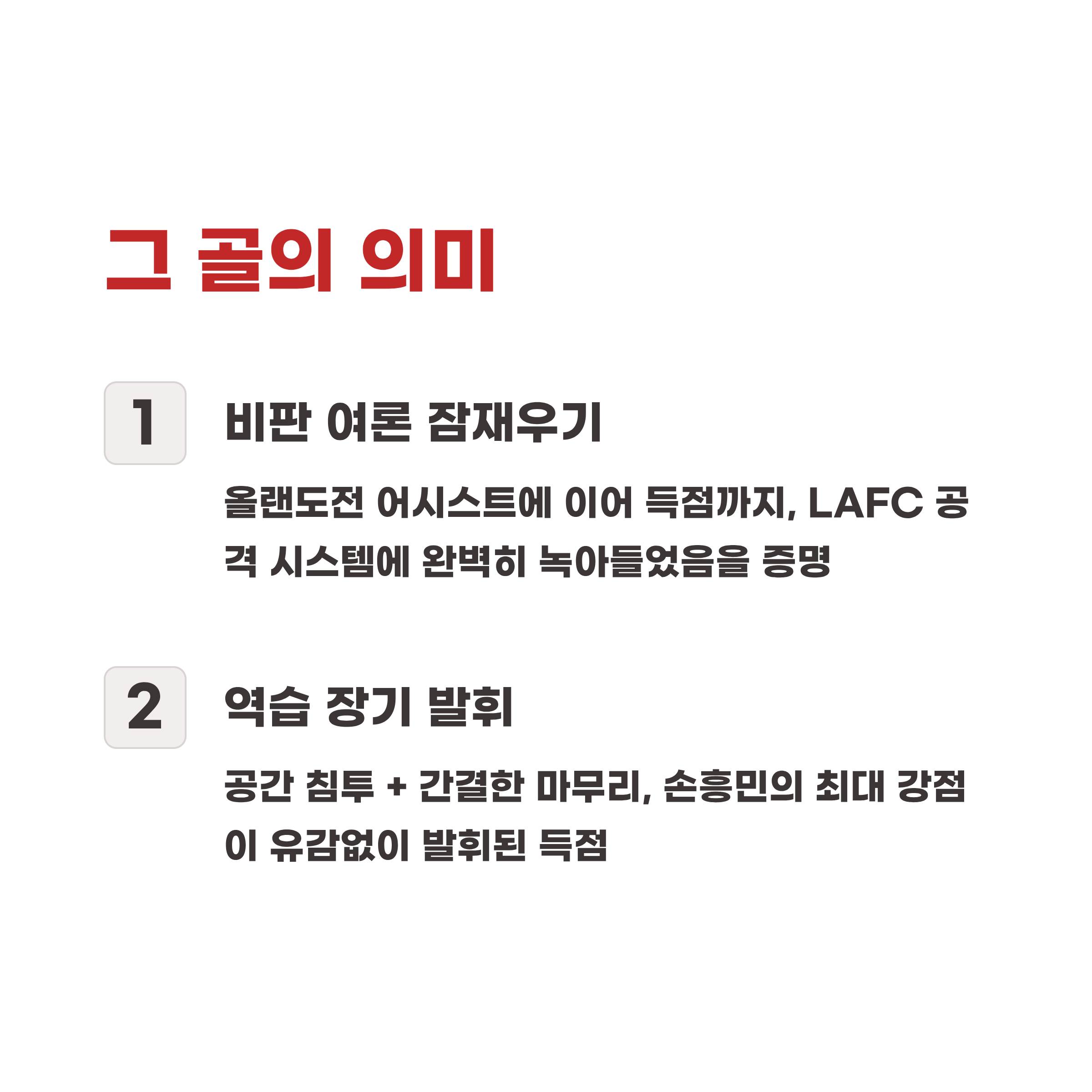 이 득점은 손흥민 개인에게도 부활을 알리는 중요한 전환점이었습니다. 오랜 기간 필드골이 없어 심리적인 압박이 상당했을 상황에서, 챔피언스컵이라는 큰 무대에서 골 맛을 보며 자신감을 되찾는 계기가 되었습니다. 특히 역습 상황에서 순간적인 공간 침투와 간결한 마무리라는 자신의 장기가 유감없이 발휘된 득점이었기에 그 의미는 더욱 큽니다. 지난 올랜도 시티전 어시스트에 이어 이번 경기 득점까지 기록하며, 비로소 LAFC의 공격 시스템에 완벽히 녹아들었음을 증명하고 비판 여론을 잠재우는 최고의 활약을 펼쳤습니다.