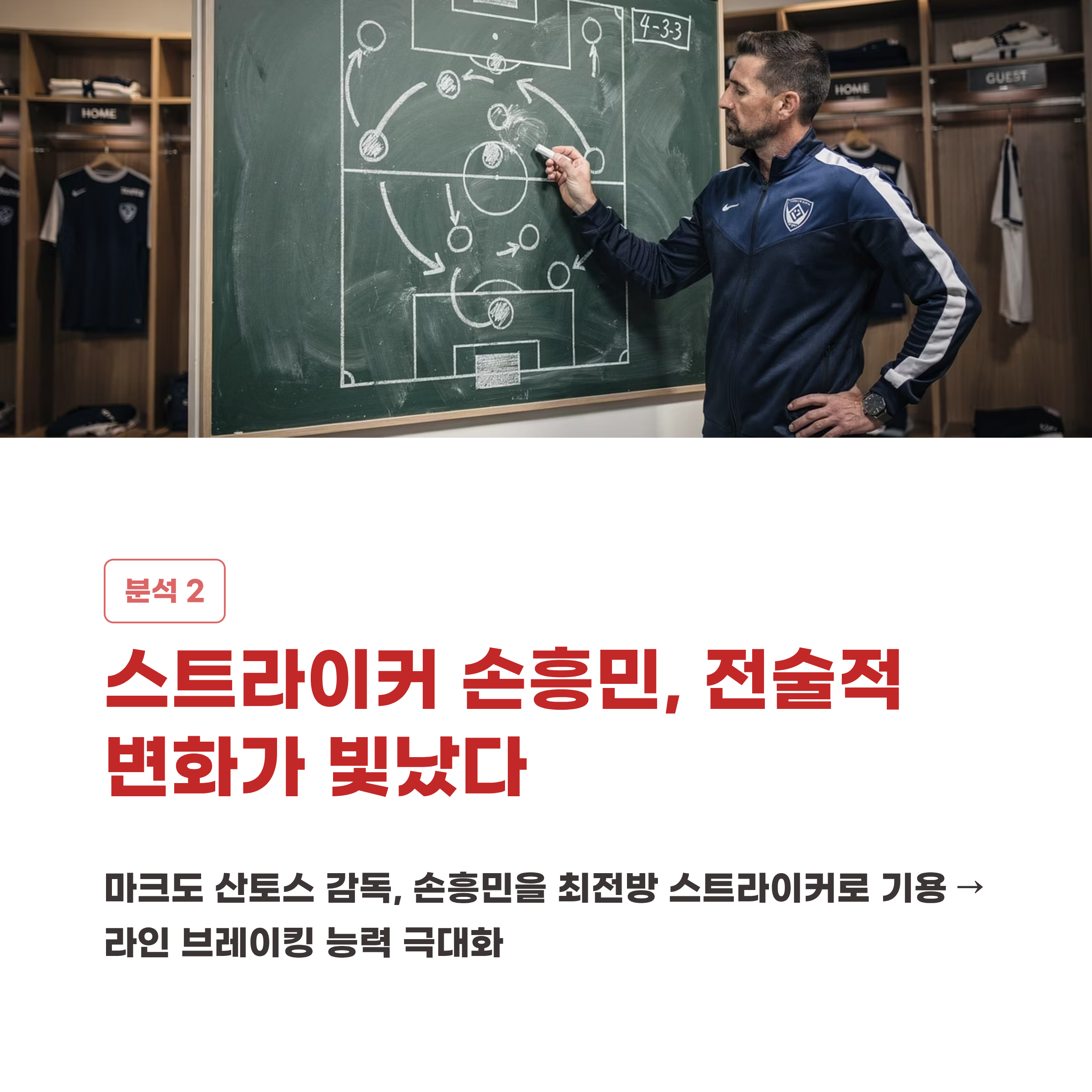 손흥민의 득점 장면은 마크도 산토스 감독의 전술적 변화가 만들어낸 완벽한 합작품이었습니다. 크루스 아술은 경기를 지배하기 위해 수비 라인을 높게 끌어올렸는데, 이는 뒷공간 침투에 세계적인 강점을 가진 손흥민에게 최적의 환경을 제공했습니다. 감독은 손흥민을 공격형 미드필더가 아닌 최전방 스트라이커로 기용하며 그의 라인 브레이킹 능력을 극대화하고자 했고, 이 선택은 정확히 맞아떨어졌습니다. 전반 30분, 역습 상황에서 마티우 니에르가 수비 뒷공간으로 침투하는 손흥민을 향해 정확한 땅볼 크로스를 연결했고, 손흥민은 특유의 스피드를 살려 슬라이딩 슈팅으로 마무리했습니다.