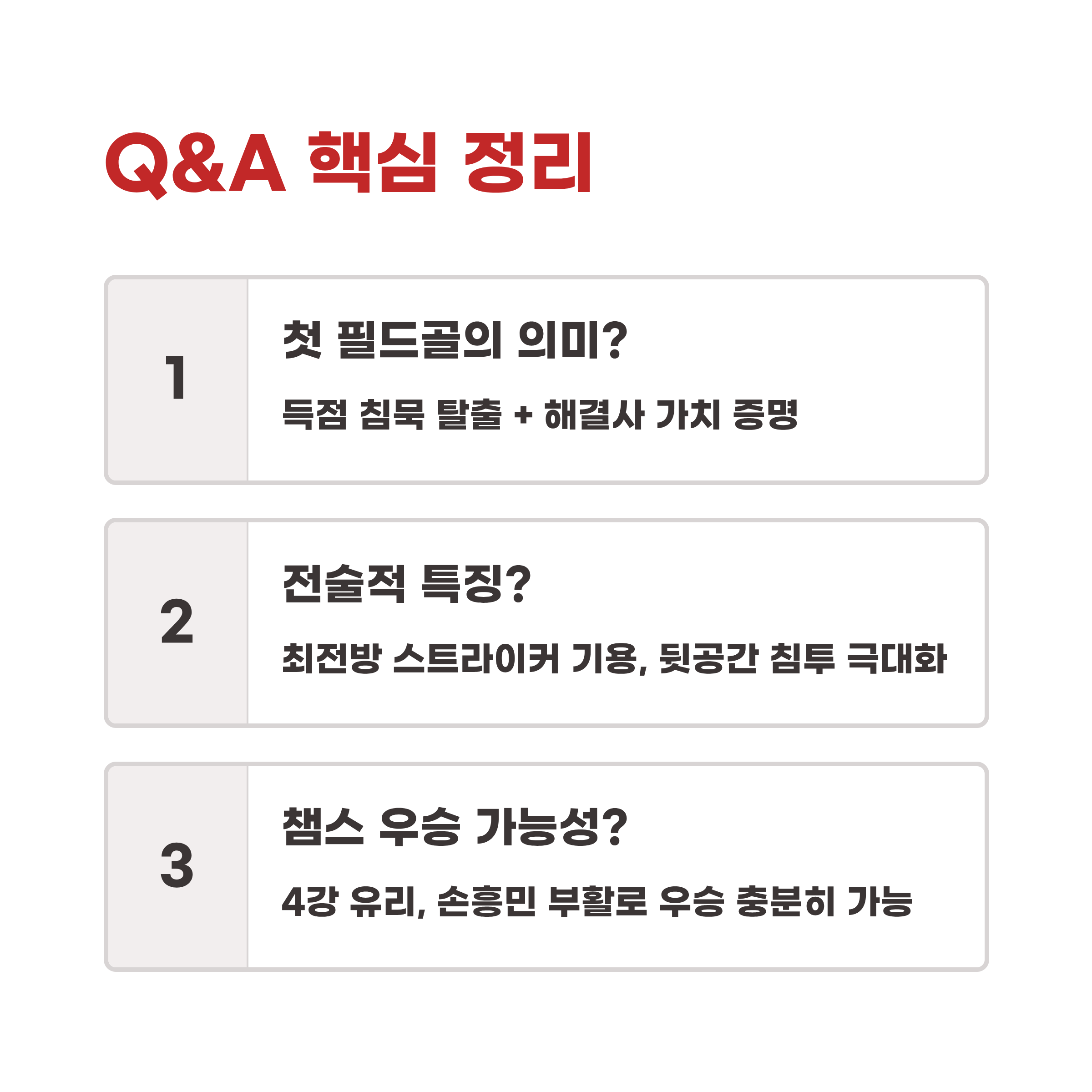 | Q1. 손흥민의 이번 시즌 첫 필드골은 어떤 의미가 있나요? |