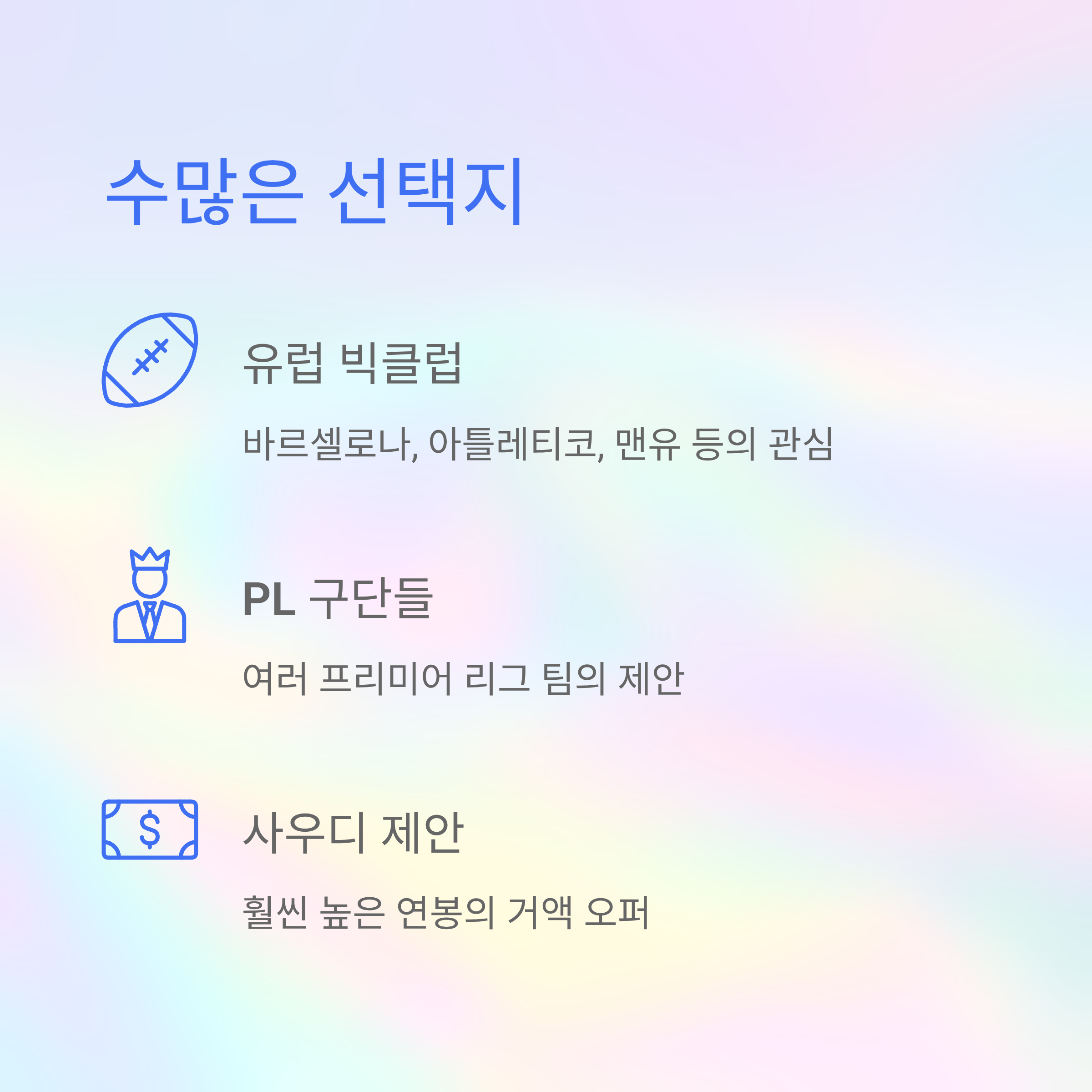 | A: 더 높은 연봉을 제시한 사우디아라비아 구단도 있었지만, 그는 돈이 아닌 도전을 택했습니다. 2026년 북중미 월드컵을 최고의 환경에서 준비하고, 미국 축구 시장을 개척하려는 야심 찬 목표가 있었습니다. 이는 그의 커리어 2막을 여는 중요한 결정이었습니다. |