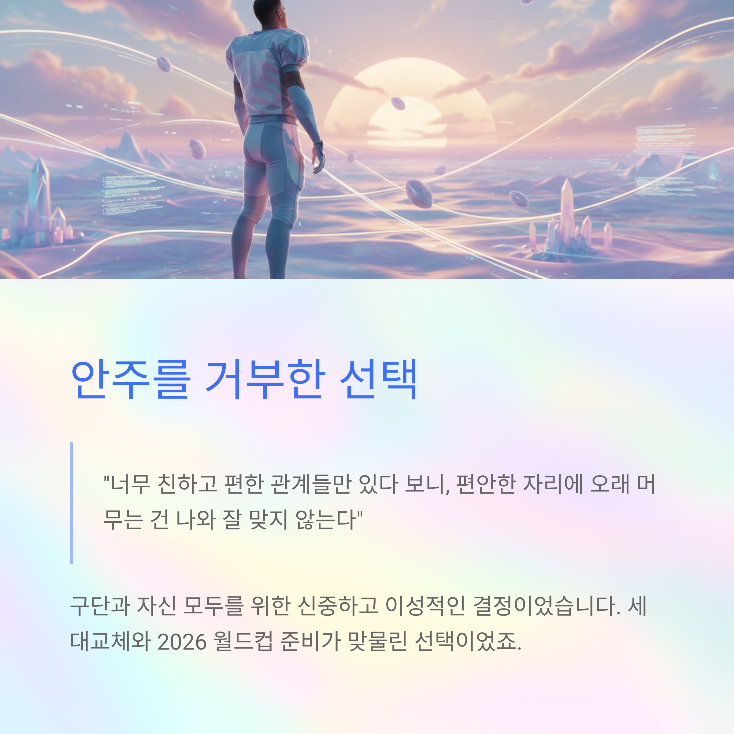 손흥민은 유로파 리그 우승 후 안주하는 것을 경계했습니다. 그는 "너무 친하고 편한 관계들만 있다 보니, 편안한 자리에 오래 머무는 건 나와 잘 맞지 않는다"라며 새로운 도전이 필요함을 느꼈다고 밝혔습니다. 만약 자신이 팀에 남는다면, 구단과 자기 자신 모두에게 좋지 않을 것이라 판단한 것입니다. 이는 팀의 점진적인 세대교체와 2026 월드컵을 최상으로 준비하고 싶은 개인의 목표가 맞물린, 매우 신중하고 이성적인 결정이었습니다. 그는 구단에 직접 이적 의사를 전달하며 아름다운 마무리를 준비했습니다.