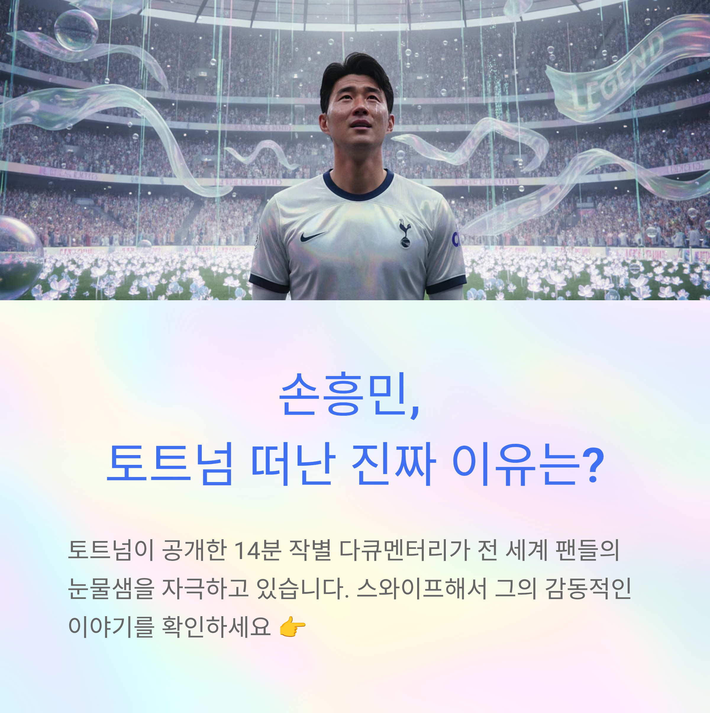 토트넘 홋스퍼가 구단 역대 최고의 스타, 손흥민의 작별 기념 다큐멘터리를 공개해 화제입니다. 손흥민이 팀을 떠난 지 반년이 지났음에도, 그는 여전히 토트넘 팬들에게 가장 사랑받는 존재입니다. 총 14분 분량의 이 다큐멘터리는 유로파 리그 우승 후 이적을 결심한 순간부터 동료들과의 가슴 뭉클한 작별, 그리고 이적 과정의 비하인드 스토리까지 풍성한 내용을 담고 있습니다. 본 글에서는 다큐멘터리의 핵심 내용을 요약하고, 특히 손흥민이 직접 밝힌 프리미어 리그 내 다른 팀의 제안을 거절한 이유 등 주목할 만한 부분을 심층 분석해 보겠습니다.