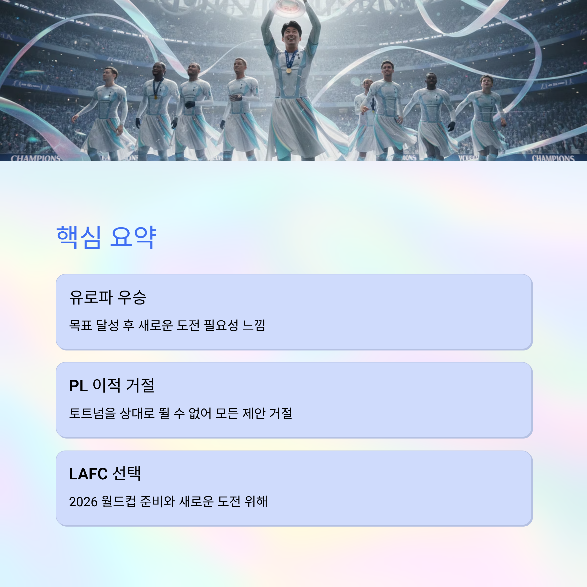 이 감동적인 작별은 그의 새로운 도전을 위한 발판이 되었습니다. 그는 MLS의 LAFC를 선택하며, 이는 돈이 아닌 도전의 가치를 우선시한 결정이었음을 명확히 했습니다. 사우디아라비아 구단이 제시한 훨씬 높은 연봉을 거절하고 미국행을 택한 것은, 2026 북중미 월드컵을 최고의 환경에서 준비하고 리오넬 메시와 함께 미국 축구 시장의 새 역사를 쓰겠다는 야심 찬 계획의 일환이었습니다. 토트넘에서의 아름다운 마무리는 그의 커리어 1막을 닫는 마침표이자, 더 큰 무대를 향한 2막을 여는 서막이 된 셈입니다.