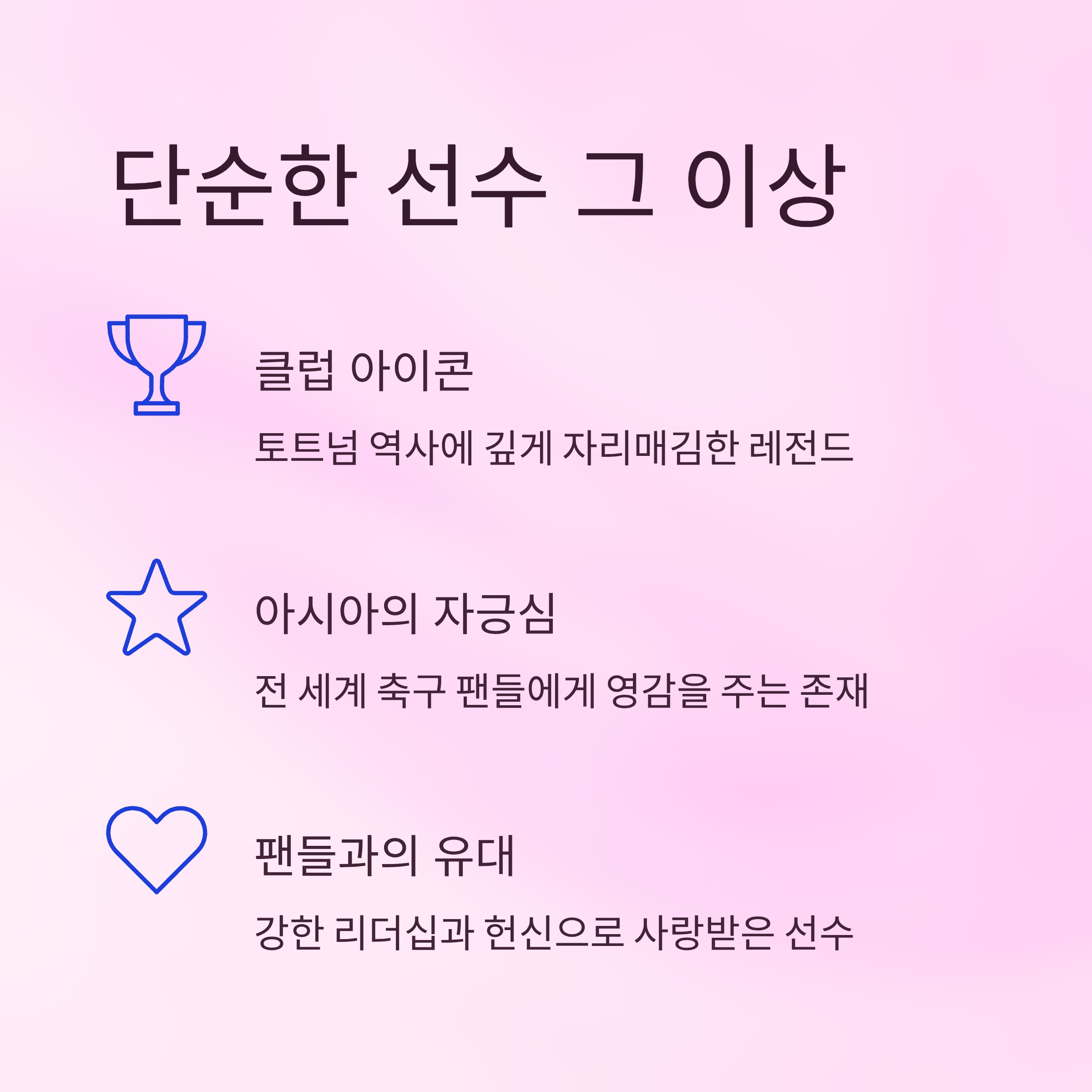 손흥민의 10년 동안의 토트넘 경력은 클럽 역사의 중요한 일부로 자리 잡았다. 454경기 출전, 173골, 주요 대회 결승 진출 등 그의 기록은 그 자체로 대단한 업적이다. 무엇보다 그는 선수로서의 기량뿐만 아니라 팬들과의 강한 유대감, 동료를 이끄는 리더십을 통해 팬들에게 사랑받는 존재로 성장했다. 그의 복귀가 더 큰 감동을 주는 이유는 팬들과의 인사라는 단순한 차원을 넘어선다. 그는 토트넘의 아이콘이자 아시아 축구계의 자긍심으로서 전 세계 축구 팬들에게 영감을 주는 존재였다. 이번 복귀는 아쉬웠던 이별의 감정을 해소하며, 손흥민이 남긴 스포츠 정신과 헌신을 되새기는 계기가 될 것이다.