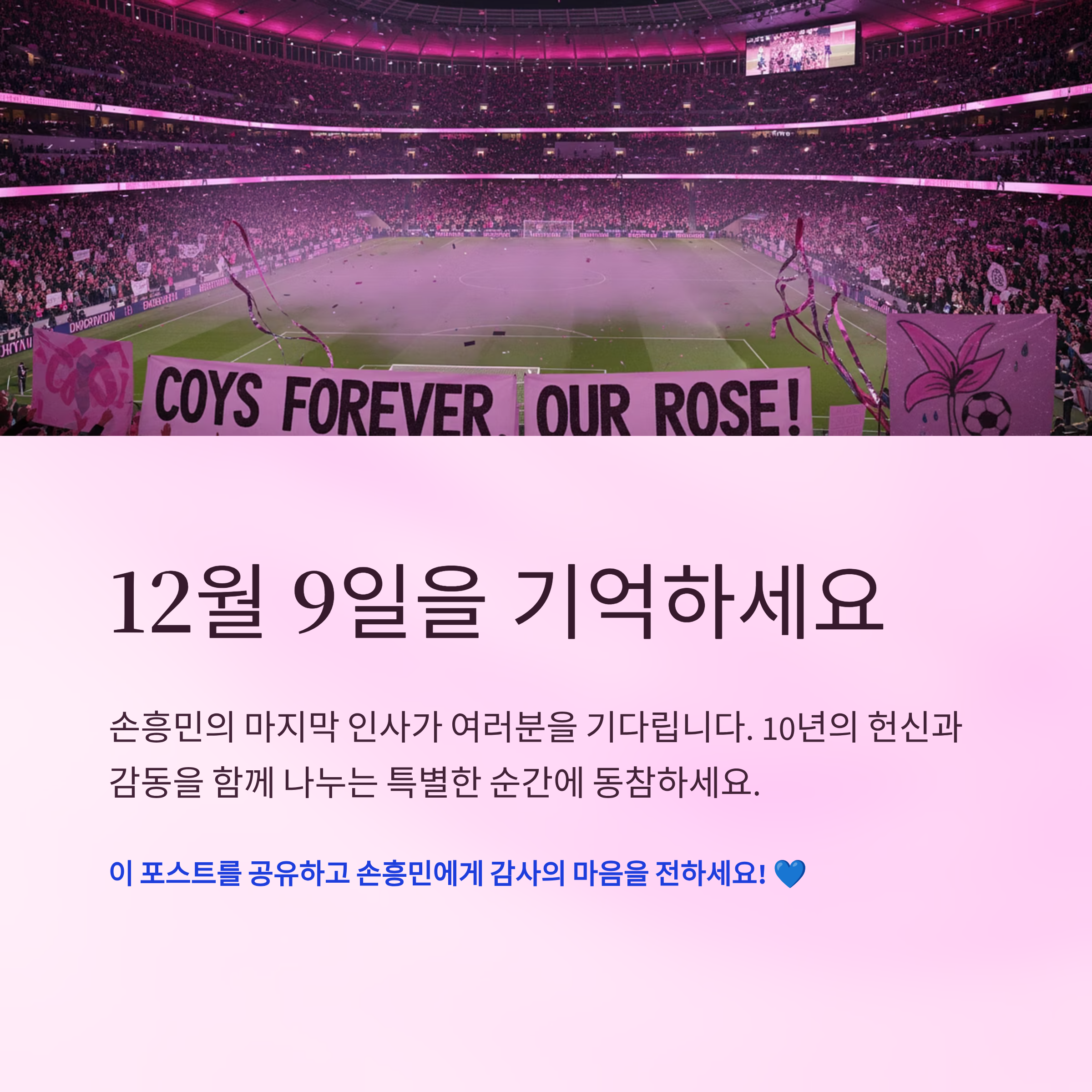 손흥민 선수가 토트넘 복귀 소식을 전하며 축구 팬들과 애정을 나눌 특별한 순간이 다가왔습니다. 그는 12월 9일 슬라비아 프라하와의 UEFA 챔피언스 리그 경기에서 팬들에게 직접 작별의 감사 인사를 전할 계획입니다. 이 소식은 손흥민을 사랑했던 팬들에게 한 줄기 기쁨을 선사하며 그의 토트넘 10년의 헌신과 의미를 한번 더 되새길 기회를 제공합니다. 손흥민은 단순한 선수 그 이상의 의미를 가진 인물로서 토트넘 역사에 깊게 자리매김하며, 아시아 축구 팬들에게도 특별한 가치를 지닌 레전드입니다.