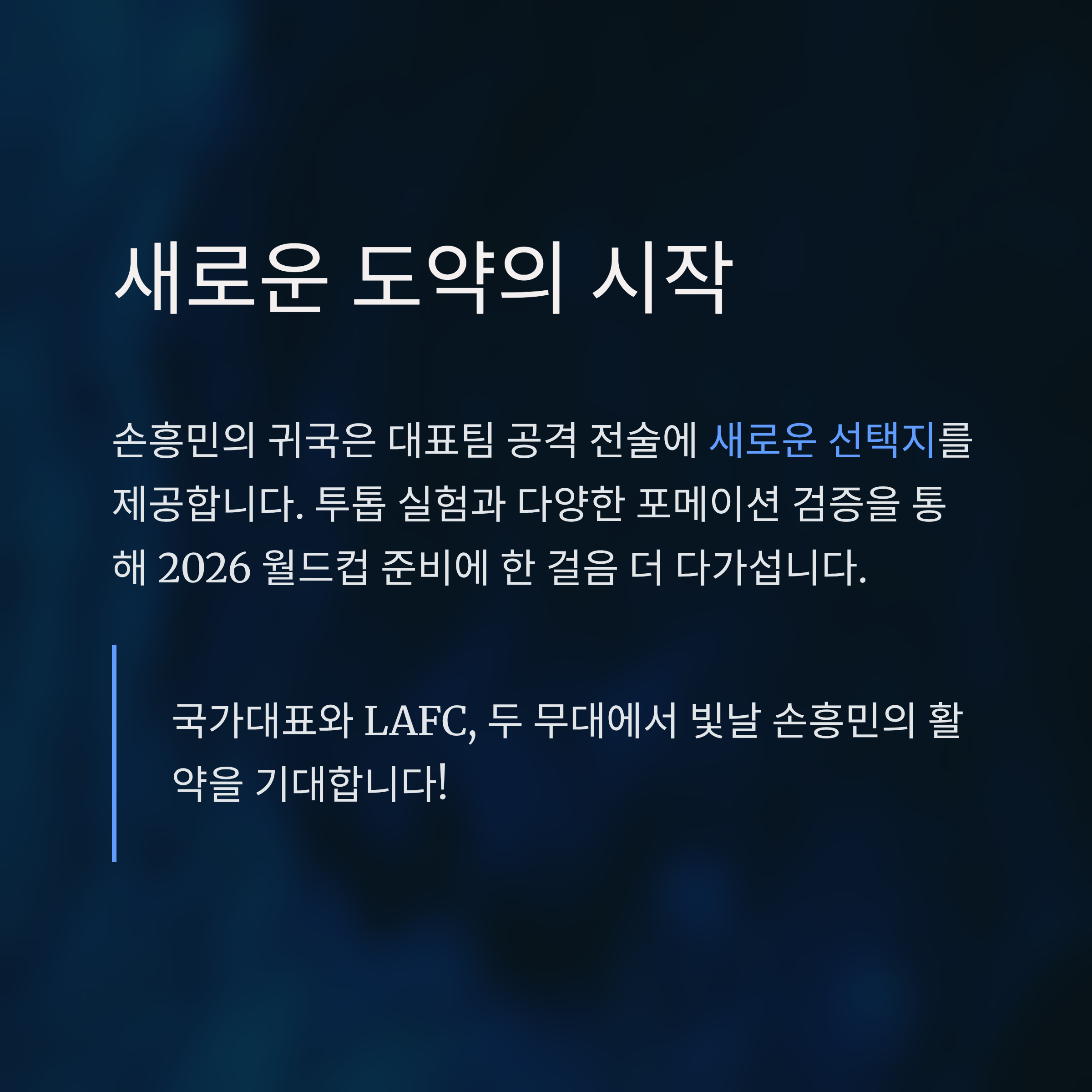 손흥민은 LAFC에서의 성공적인 시즌을 바탕으로 한층 자신감 있는 경기력을 대표팀에서도 이어갈 것으로 보입니다. 그는 다양한 국제 대회 경험과 심리적 안정감을 통해, 대표팀 내에서도 리더십과 경기 조율 능력을 동시에 발휘할 수 있는 자원입니다.
