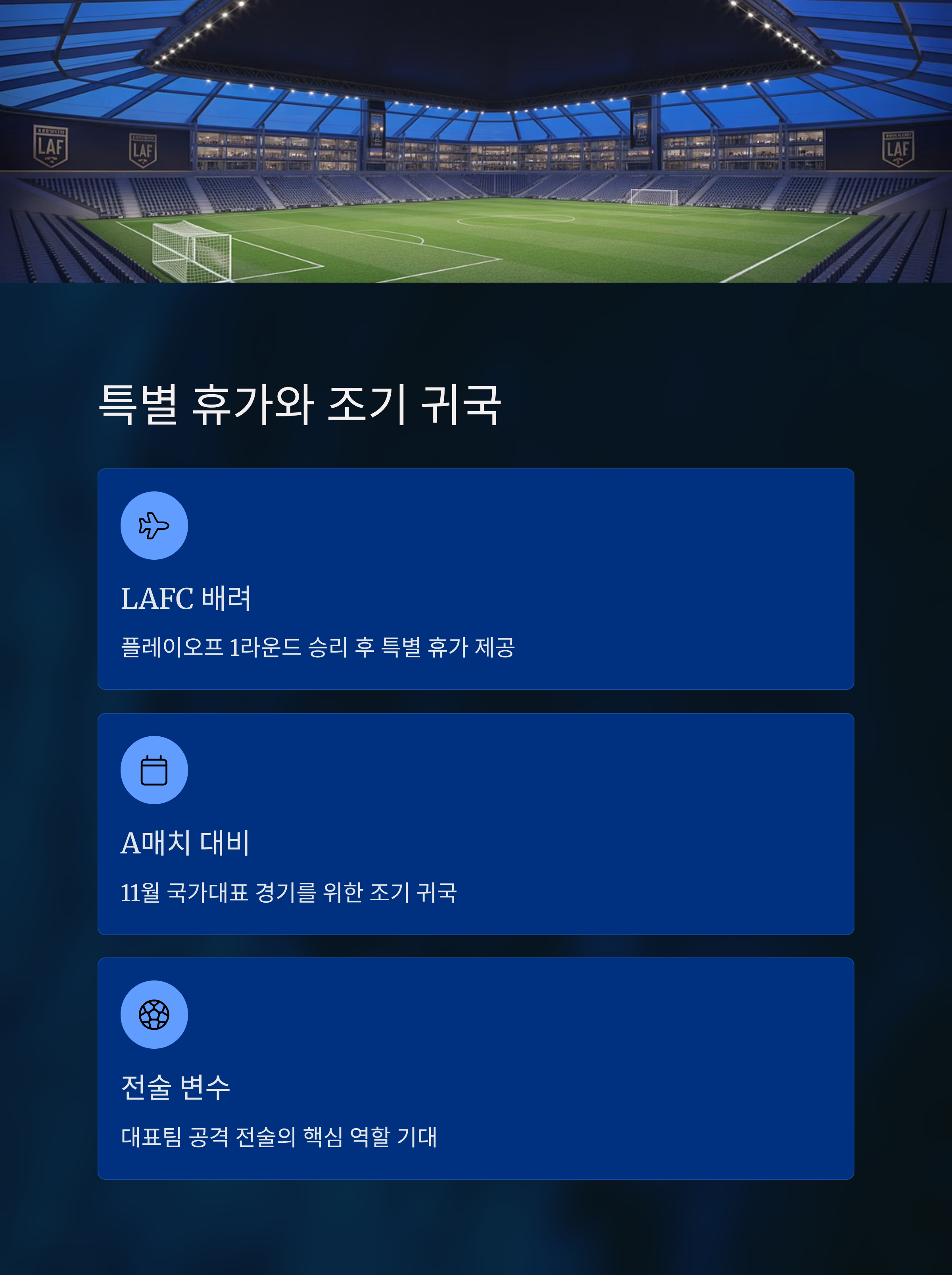 최근 LAFC에서 뛰고 있는 손흥민 선수가 소속팀의 특별 배려로 대한민국으로 조기 귀국했습니다. 그는 오스틴 FC와의 플레이오프 첫 라운드 승리 이후 특별 휴가를 받아 11월 A매치에 대비하고 있습니다. 손흥민의 복귀는 대표팀에서 중요한 전술 변수로 작용할 가능성이 커 팬들의 이목을 집중시키고 있습니다. 볼리비아와 가나와의 평가전을 통해 손흥민의 컨디션과 역할을 점검하며 2026 월드컵을 위한 전력을 다듬는 기회가 될 것입니다. 아울러 소속팀 LAFC에서의 활약과 서부 컨퍼런스 준결승 일정도 함께 점검할 필요가 있습니다. 본 글에서는 이러한 내용을 상세히 접근해보겠습니다.