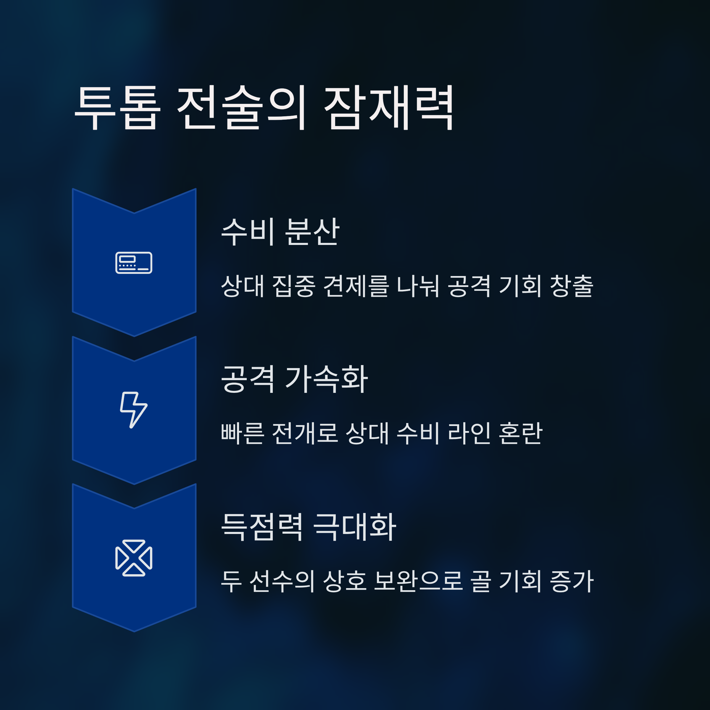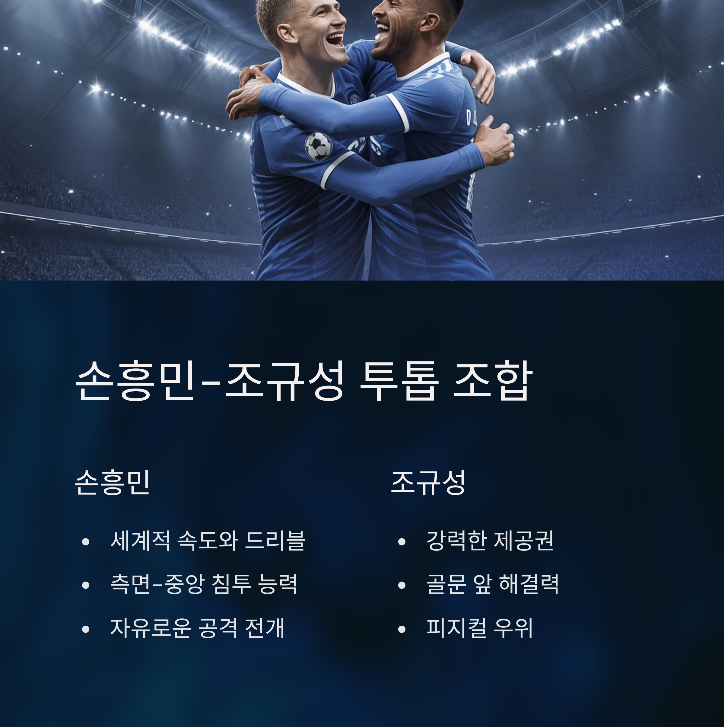 손흥민은 세계적인 수준의 공격수로, 그동안 다양한 스타일의 파트너들과 조화를 이루며 경기력을 입증해왔습니다. 조규성은 제공권과 골 결정력에서 뛰어난 기량을 지닌 만큼, 손흥민의 속도와 드리블을 극대화할 수 있는 이상적인 조합으로 평가됩니다. 이 두 선수가 함께 투톱으로 나설 경우, 상대 수비의 견제를 분산시키며 더 빠르고 다양한 공격 루트를 창출할 수 있습니다.