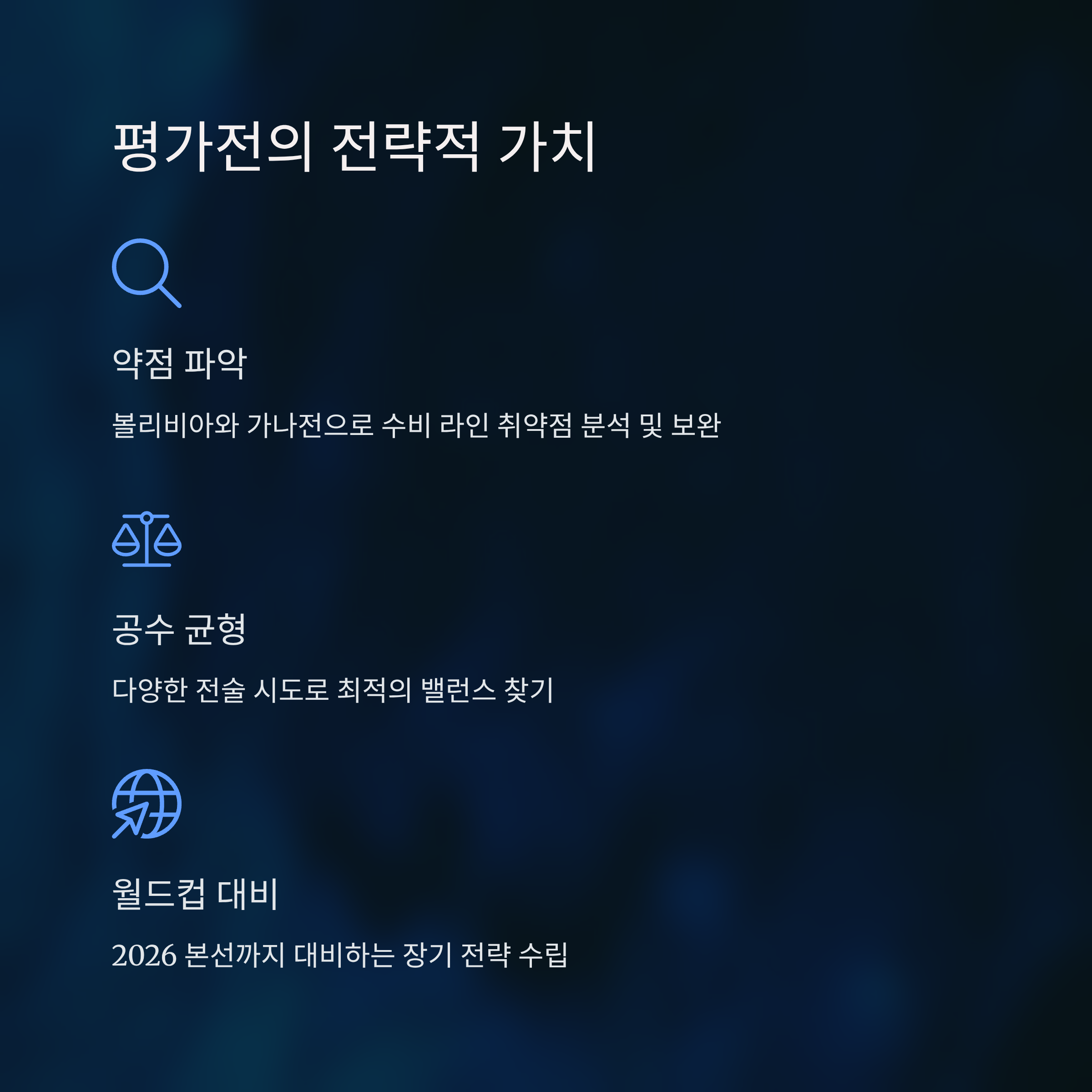 볼리비아와 가나와의 평가전은 이러한 변화 가능성을 실험하기에 적절한 무대입니다. 대표팀은 이 기회를 통해 수비 라인의 약점 보완과 공격 전개의 다양한 전략을 검증하게 되며, 이는 월드컵 예선뿐 아니라 본선 무대 대비에도 긍정적인 시사점을 제공할 수 있습니다.