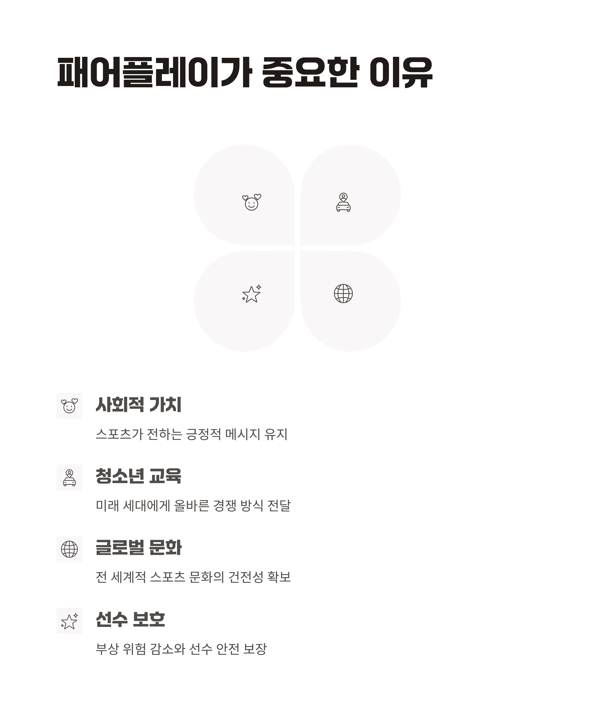 A. 패어플레이는 스포츠가 가지는 사회적 메시지를 유지하는 데 중요한 역할을 합니다. 이는 경쟁 속에서도 공정성과 협력을 강조하는 가치를 담고 있습니다.