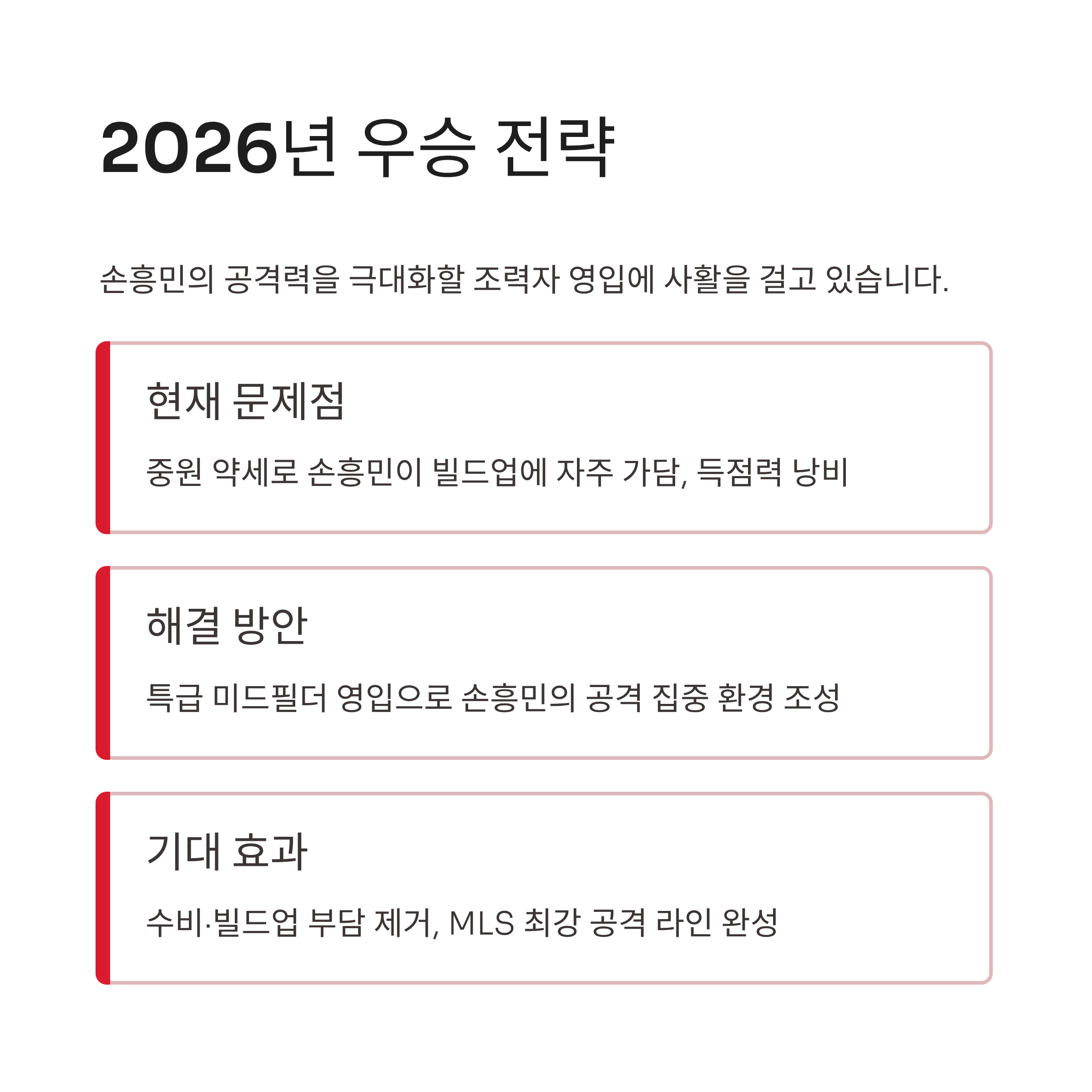 | 2026년 영입 전략 | 손흥민 지원을 위한 중앙 미드필더 영입 집중 |