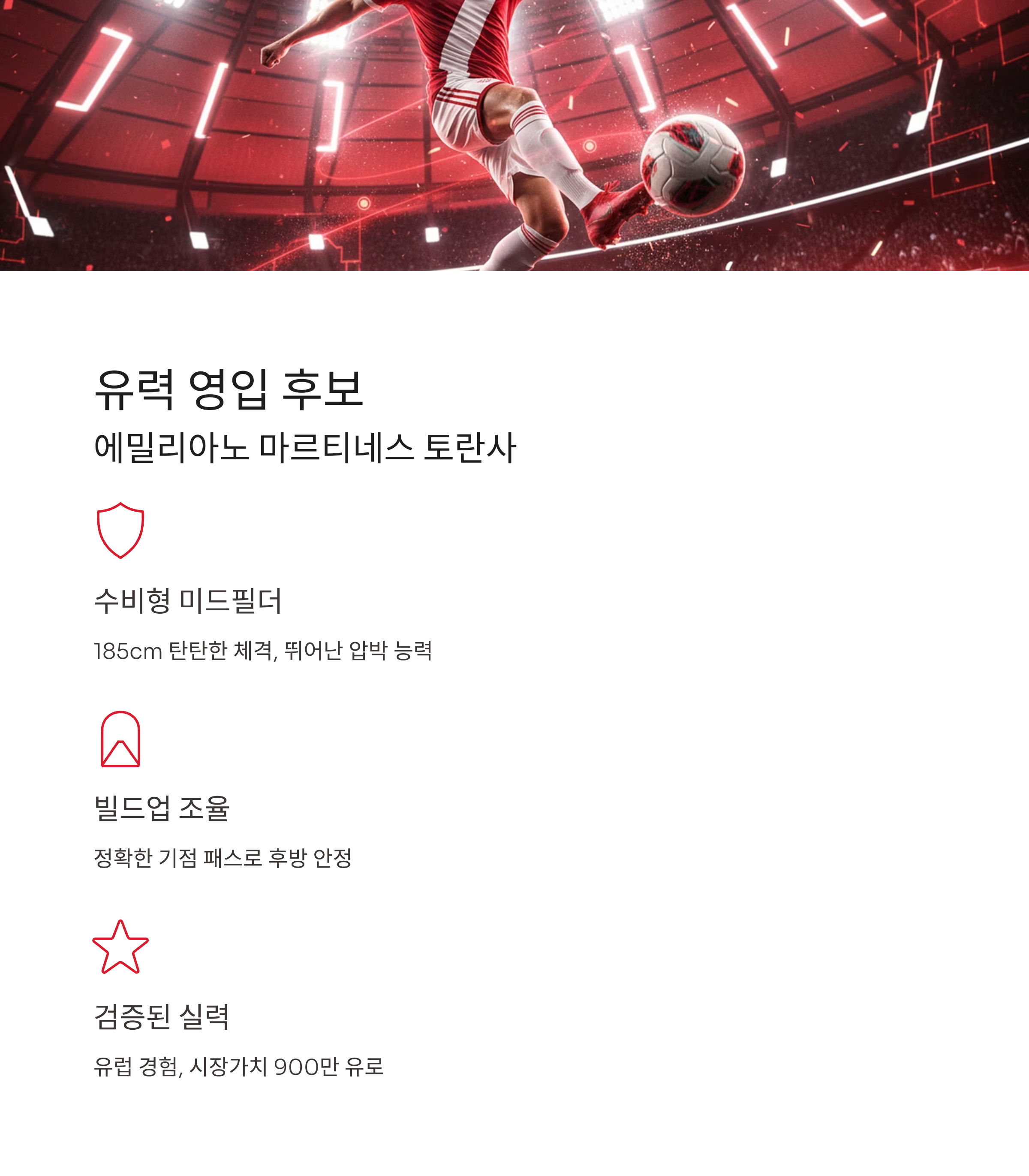 현재 구단이 추진 중인 에밀리아노 마르티네스 토란사와 같은 미드필더 영입은 이러한 목표를 달성하기 위한 구체적이고 현실적인 전략입니다.
