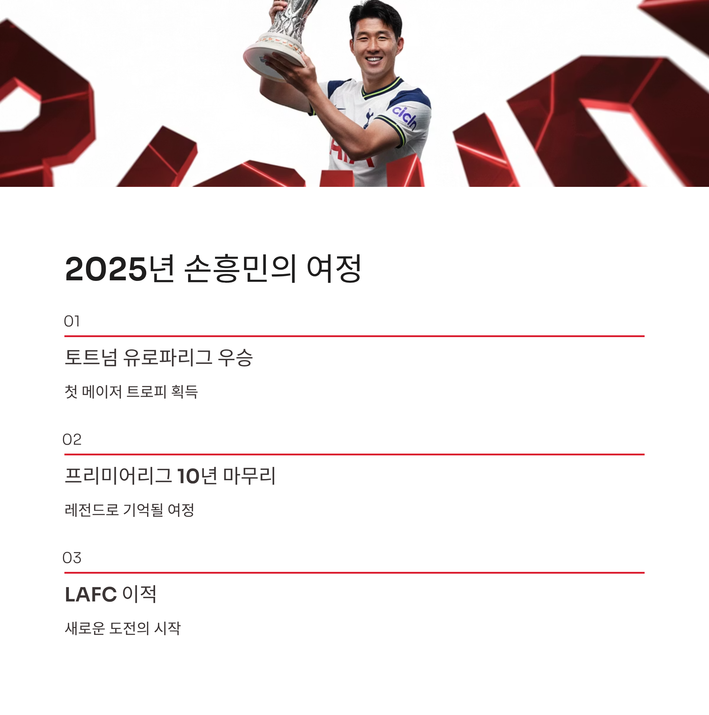 | 손흥민 2025년 성과 | 토트넘 유로파리그 우승, LAFC 이적 후 13경기 12골 4도움 |