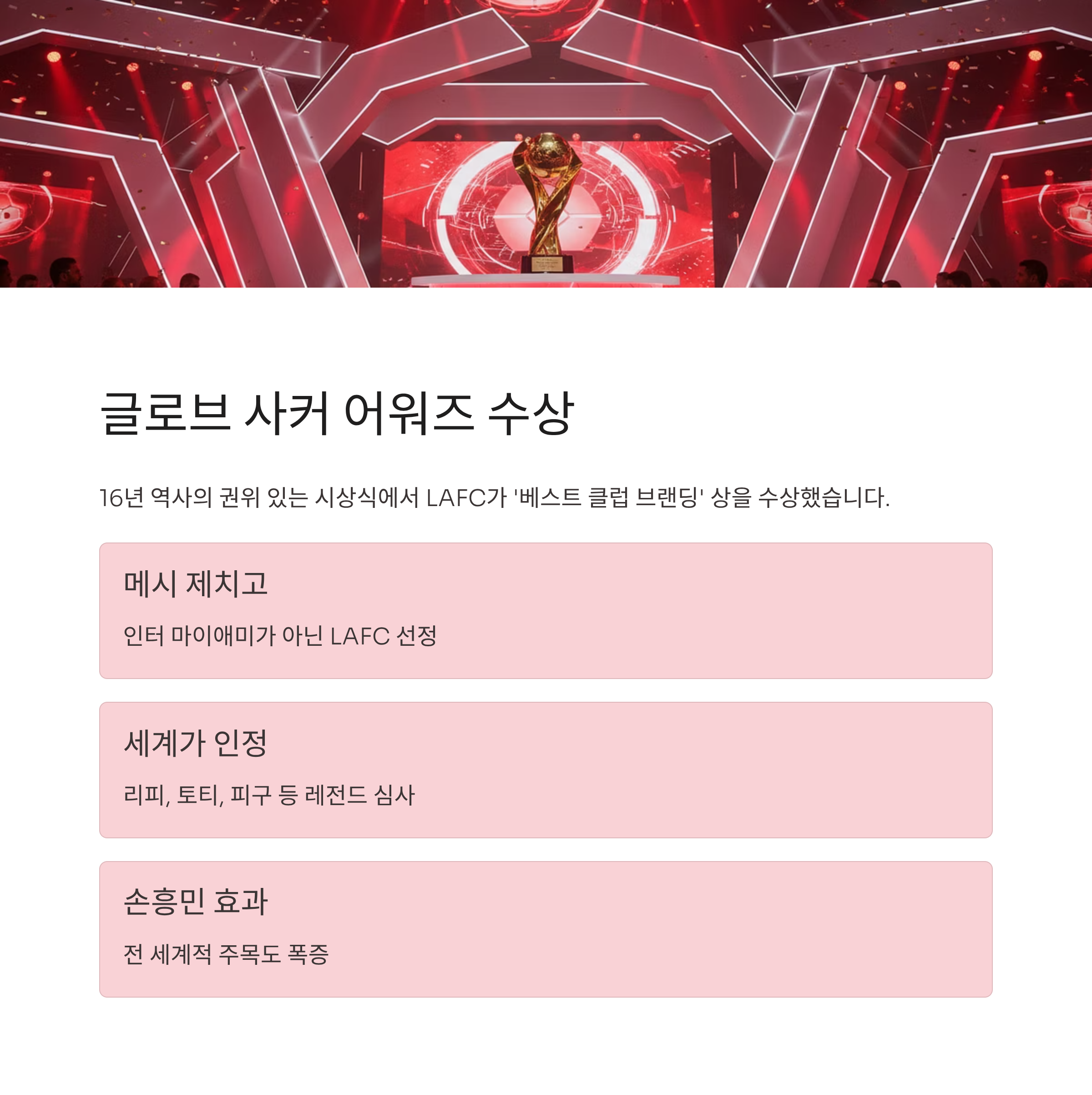 글로브 사커 어워즈에서 LAFC가 메시의 인터 마이애미를 제치고 '베스트 클럽 브랜딩' 상을 수상한 것은 그 어떤 기록보다 '손흥민 효과'의 실체를 명확하게 보여주는 상징적인 결과입니다.