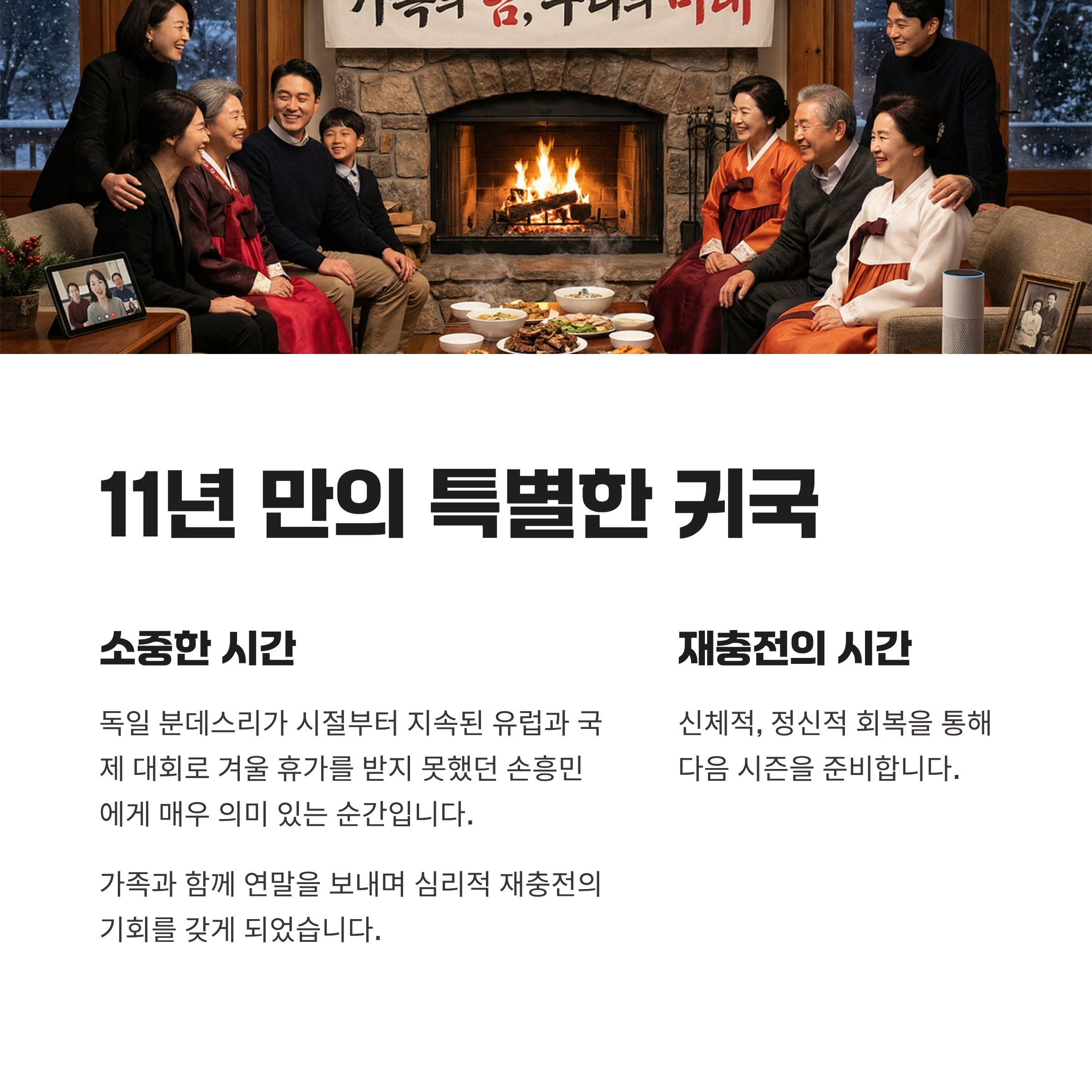 | A. 손흥민의 한국 귀국은 11년 만의 휴식으로, 가족과 함께 연말을 보내며 재충전할 기회를 가진다는 점에서 중요한 의미를 갖습니다. 이는 그의 컨디션 회복과 자신만의 새 출발을 준비하는 계기가 될 것입니다. |