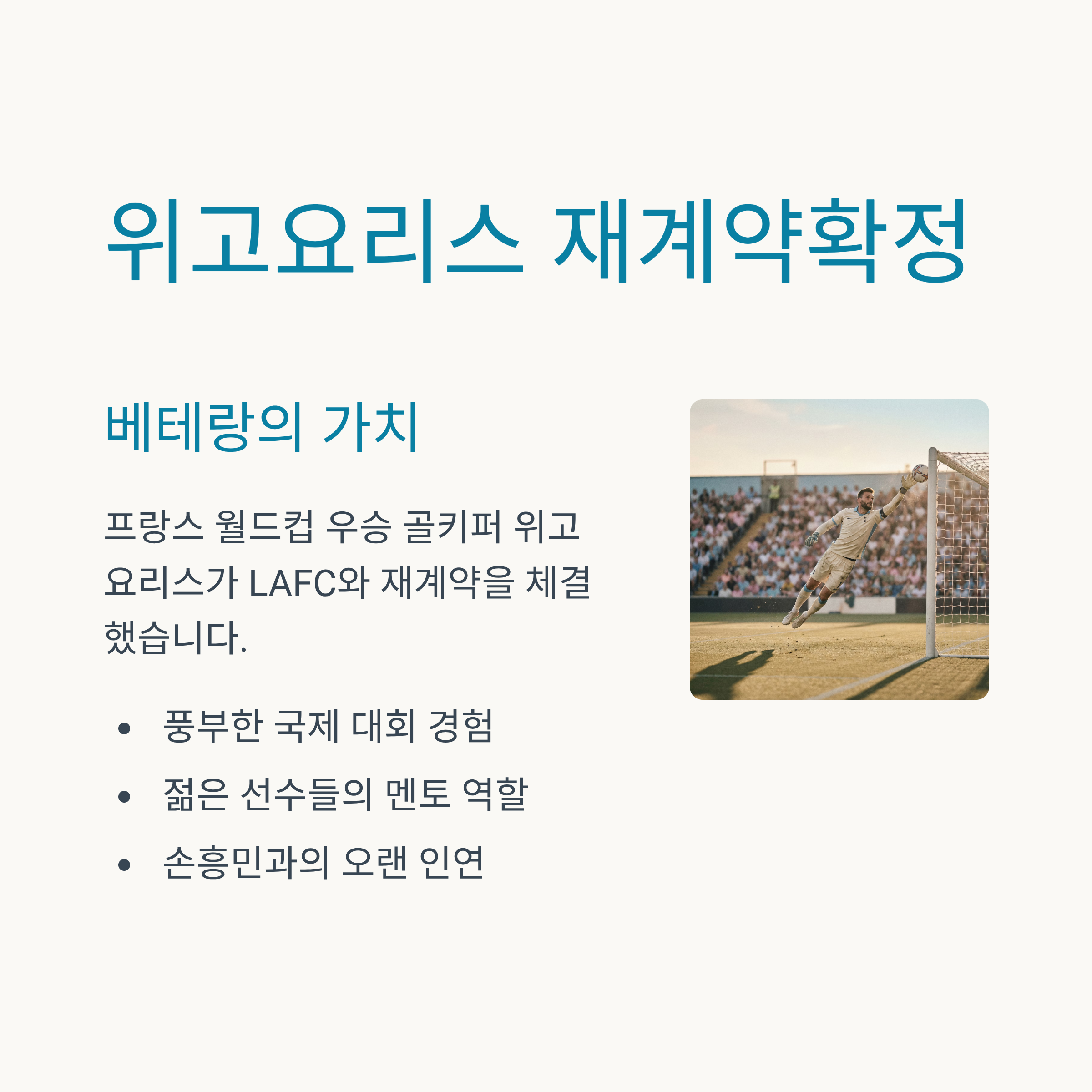 특히 프랑스 월드컵 우승 경험을 가진 골키퍼 위고 요리스가 LAFC와의 재계약을 확정하면서, 내년 시즌 그의 가치와 리더십이 팀에 미칠 긍정적인 영향을 예상하게 됩니다. 다음 시즌 준비가 이미 시작된 상황에서, 손흥민과 함께 나아갈 LAFC의 변화와 전망에 대해 심층적으로 분석하고자 합니다.