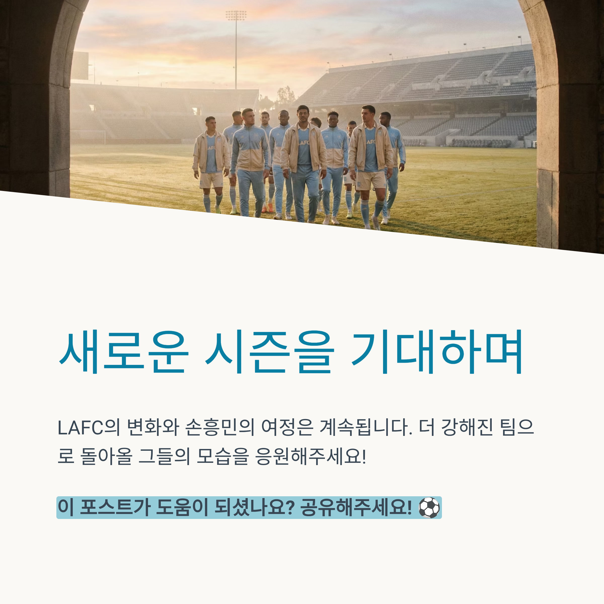 다음 시즌이 다가올수록 LAFC가 이룩하게 될 변화와 목표들은 시즌 초반부터 분명한 윤곽을 드러낼 것입니다. 앞으로 더욱 긴밀히 협력해 나갈 손흥민과 팀의 새로운 가능성이 기대됩니다.