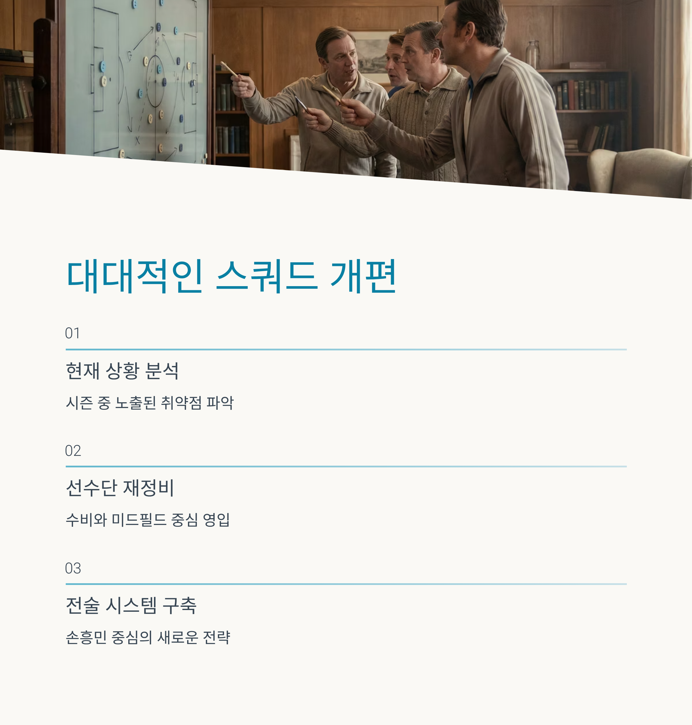 2025 시즌 종료 후 LAFC는 대대적인 선수단 개편 계획을 발표했습니다. 현재 수비와 미드필드 보강이 최우선 과제로 선정되었으며, 시즌 중 노출된 취약점을 해결하기 위해 새로운 전술 접근법이 필요합니다. 이는 스쿼드 변화뿐 아니라 새로운 감독의 전술 철학과도 중요한 연결고리가 될 전망입니다.