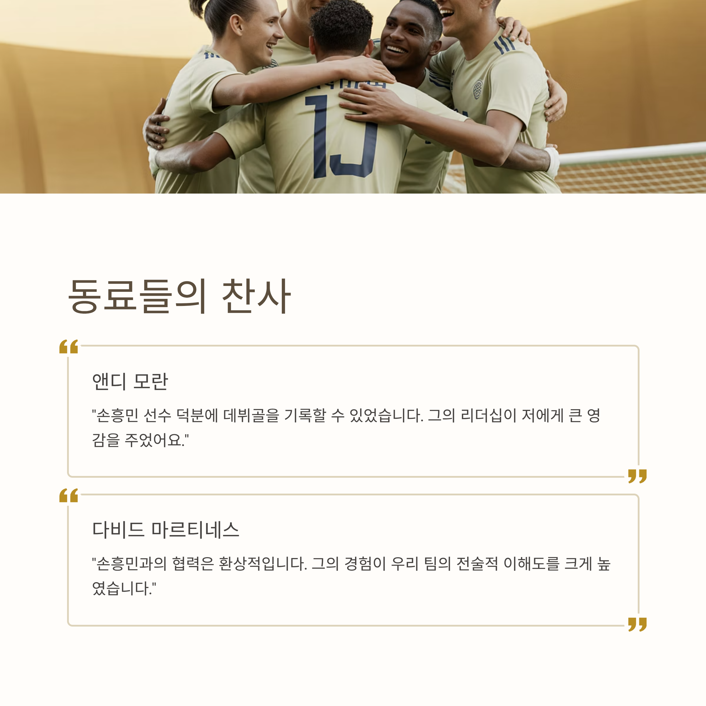 2. 동료 선수들은 손흥민 선수의 리더십과 경기력을 높이 평가하며, 그의 존재가 팀에 미치는 영향에 대해 감탄하고 있습니다.