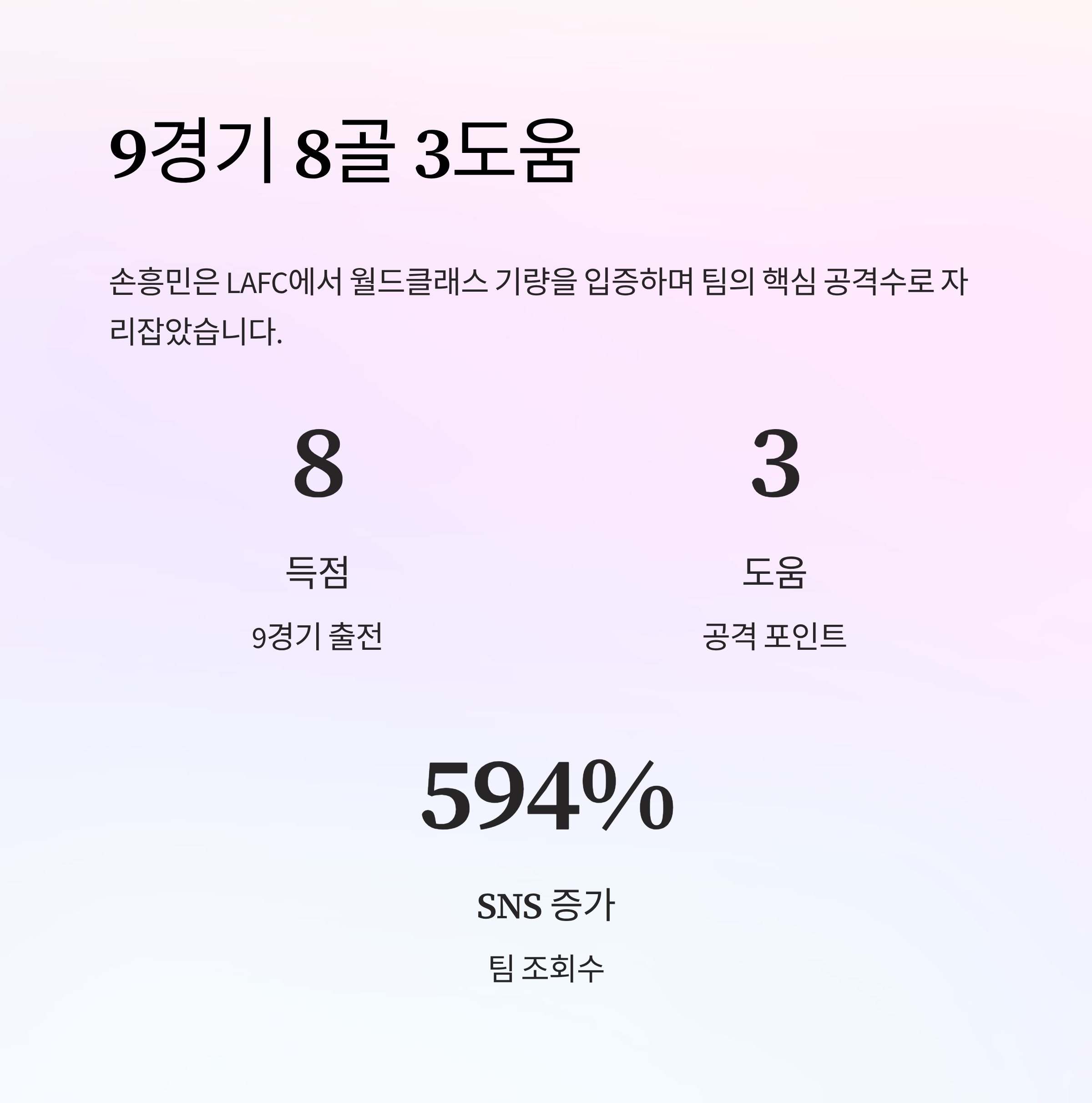 1. 손흥민(LAFC)은 메이저리그 사커에서 뛰어난 성적을 기록 중이며, 9경기에서 8골 3도움을 기록했습니다.