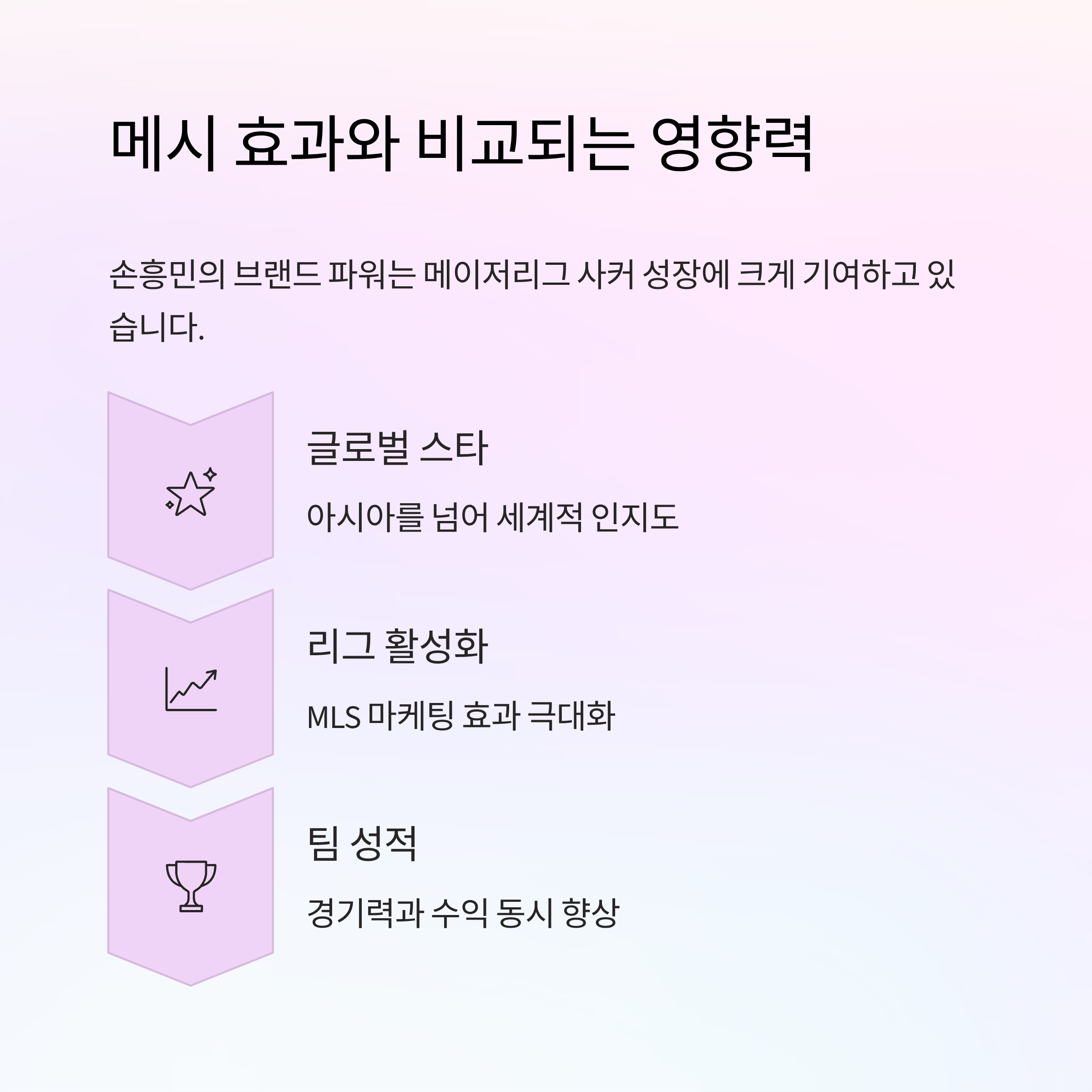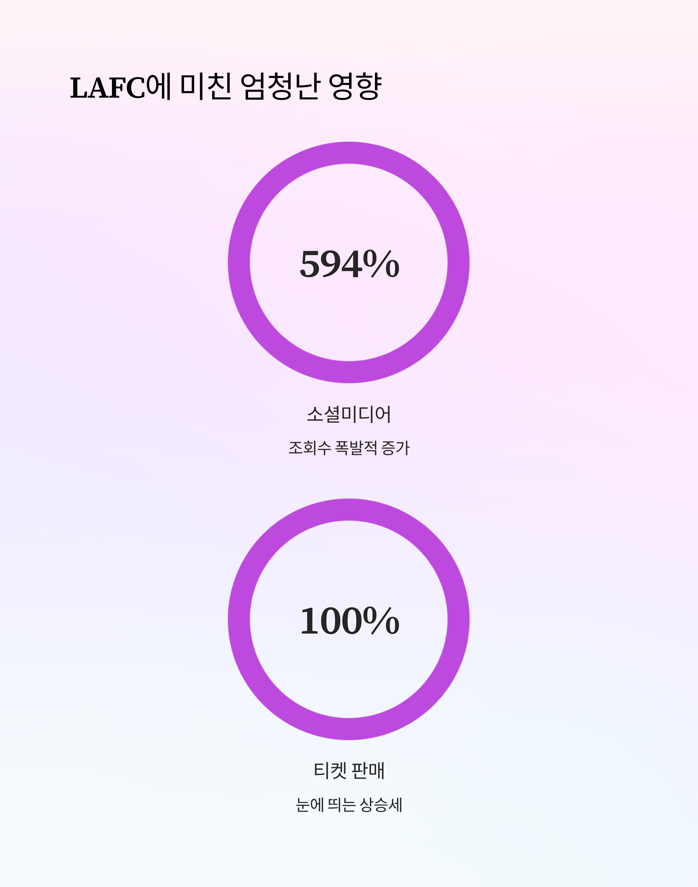 손흥민의 LAFC 이적은 단순히 경기력 향상을 넘어 마케팅과 리그 성장에도 큰 영향을 미쳤습니다. 그의 합류 이후 팀의 소셜미디어 조회수는 594% 증가했으며, 티켓 판매량 또한 눈에 띄게 상승했습니다. 이는 이전 리오넬 메시의 MLS 데뷔 효과와 비교될 정도로 긍정적인 영향을 끼쳤으며, 손흥민이라는 브랜드 자체가 얼마나 강력한지를 다시금 증명하는 사례가 되었습니다. 이처럼 손흥민은 글로벌 영향력 면에서도 메이저리그 사커의 성장에 크게 기여하고 있습니다.