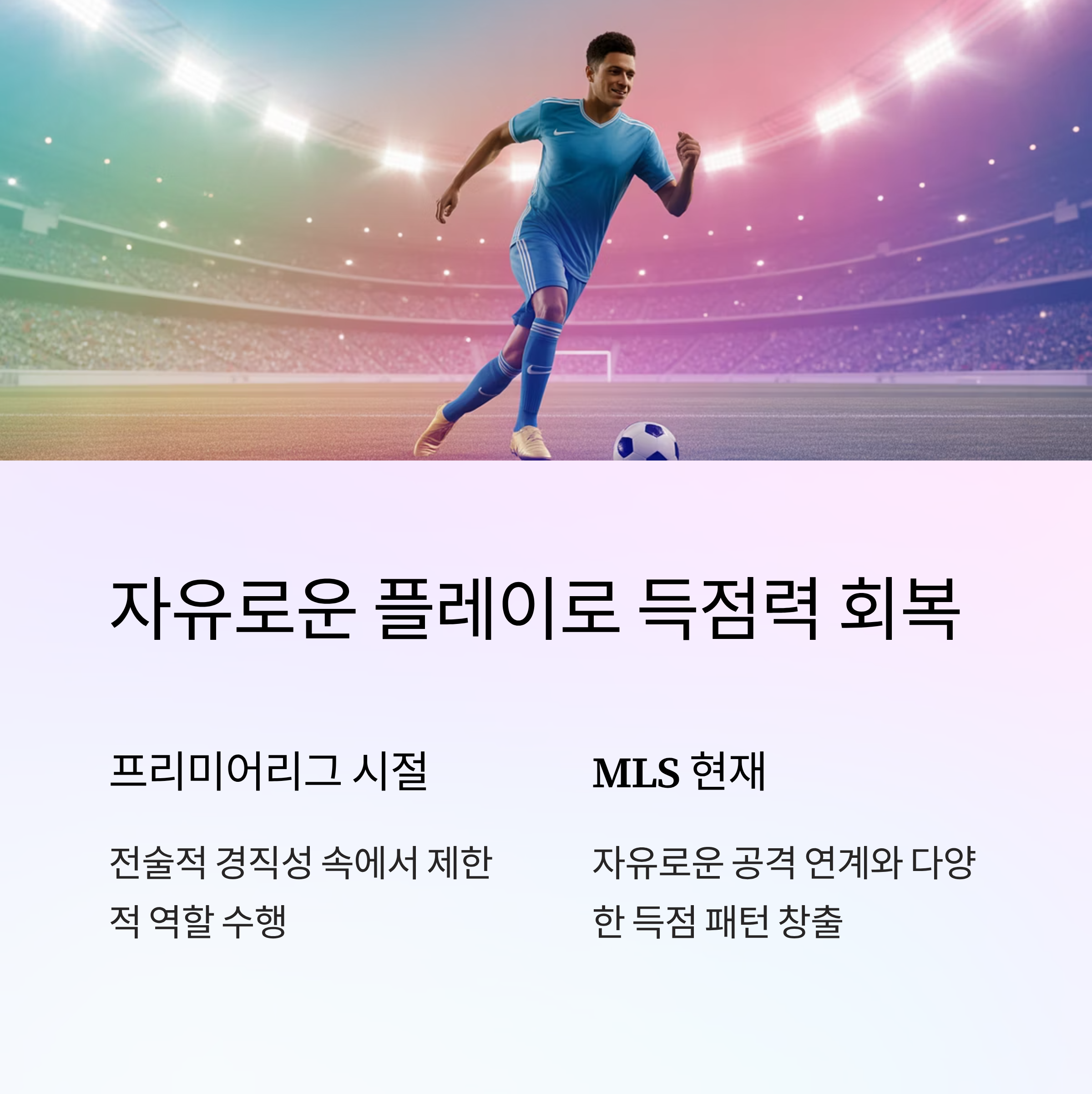 손흥민은 메이저리그 사커(LAFC)에서 단 몇 경기만에 소위 ‘월드 클래스’ 선수임을 입증했습니다. 9경기 동안 8골과 3도움을 기록하며 팀의 핵심적인 공격 자원으로 자리 잡았으며, 이는 경기 당 평균 1개 이상의 직접적인 공격 포인트를 기록한 셈입니다. 특히 그의 득점 스타일은 기존 프리미어리그 시절과 비교했을 때 큰 차별성을 보입니다. 상대적으로 전술적인 경직성이 적은 리그 특성 덕분에 손흥민은 더욱 자유롭게 공격과 연계 플레이를 할 수 있었고, 그 결과 더 다양하고 감각적인 득점 장면을 만들어내고 있습니다.
